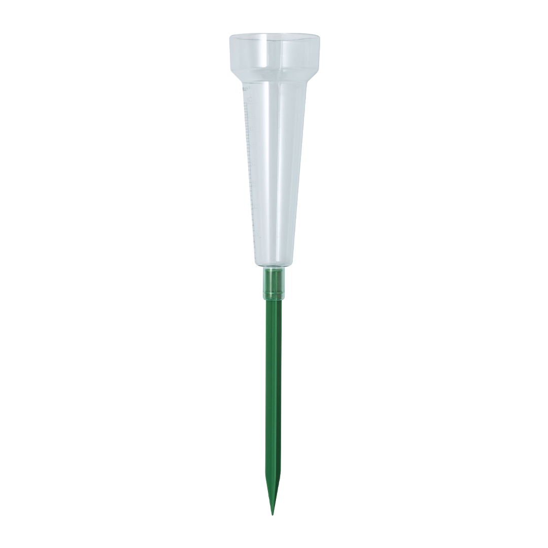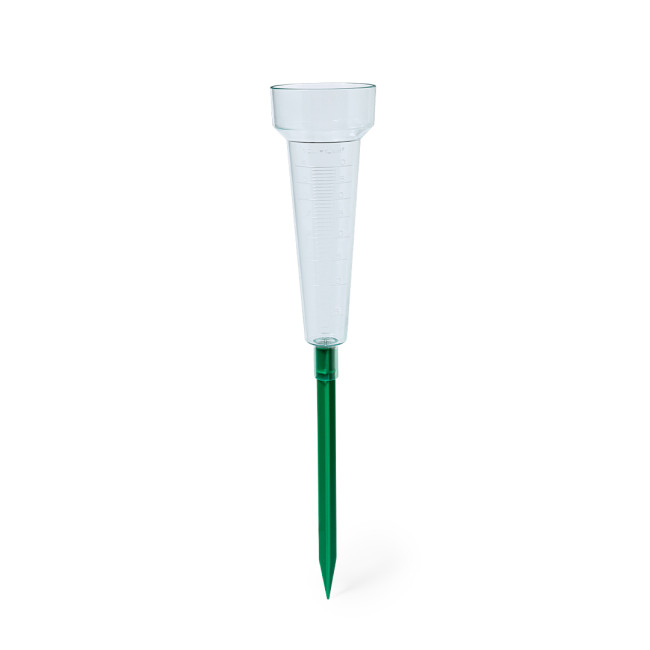 Pluviometro da 40l/m2 con corpo in finitura trasparente e robusto picchetto di fissaggio.