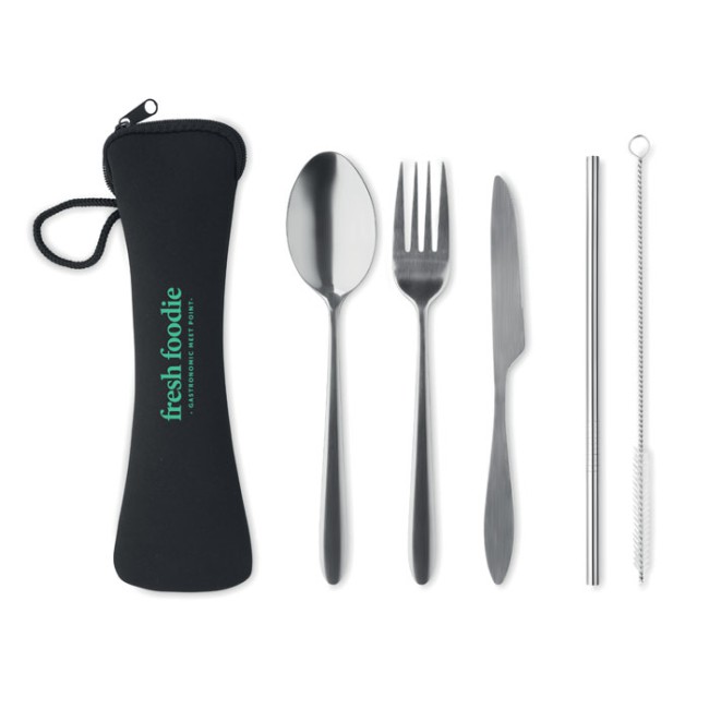 Servizio di posate riutilizzabili in acciaio inossidabile da portare facilmente ovunque si vada e perfetto per portare il pranzo al lavoro. Questo set include forchetta, coltello, cucchiaio, cannuccia e spazzolino per pulizia della cannuccia. Il set è confezionato in custodia in neoprene con cerniera e cordino di chiusura.