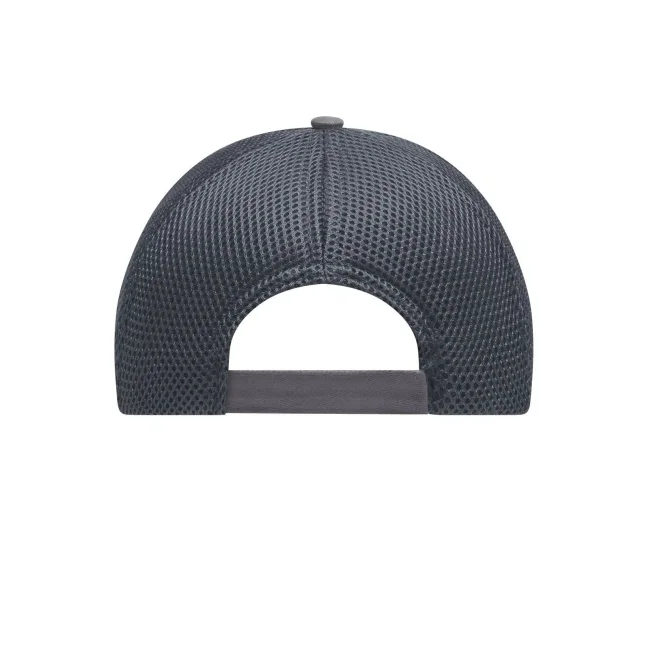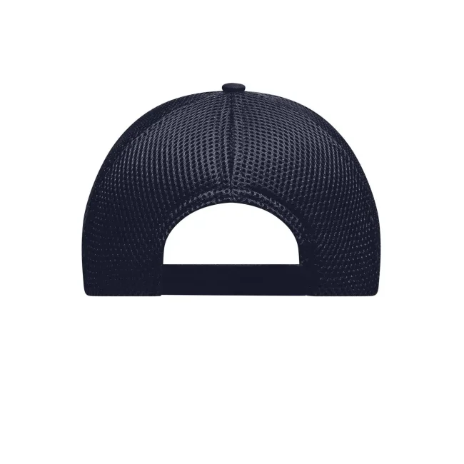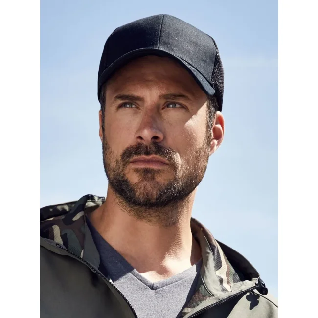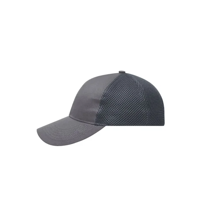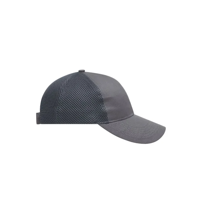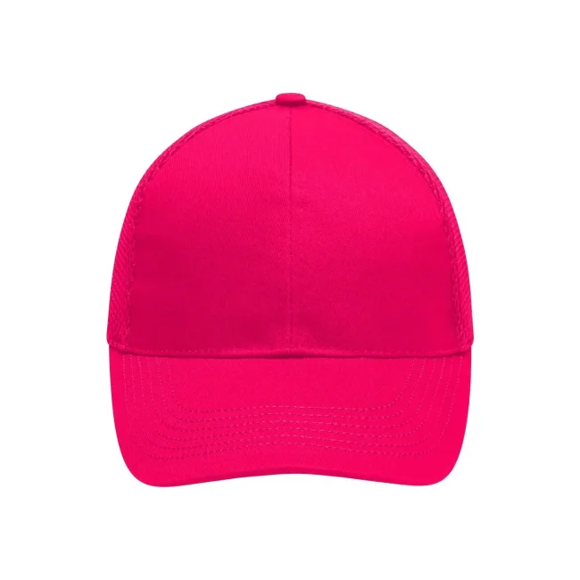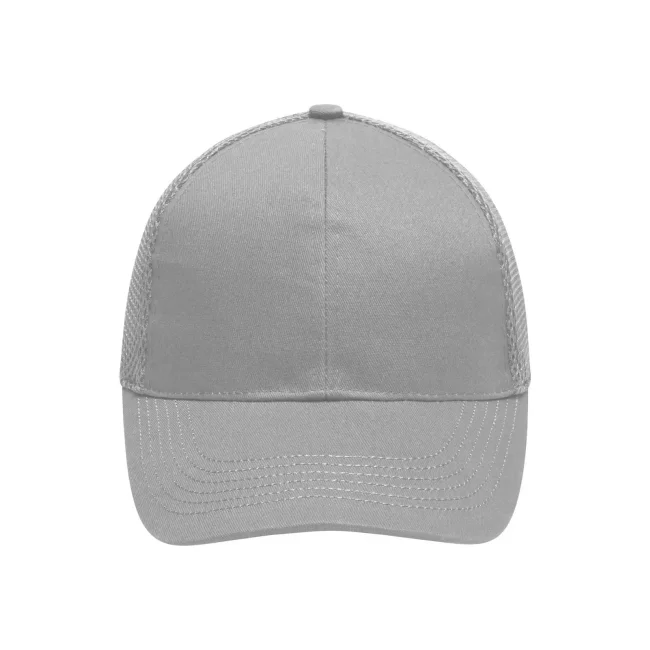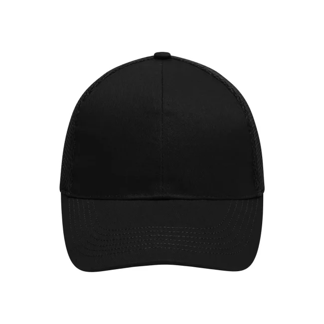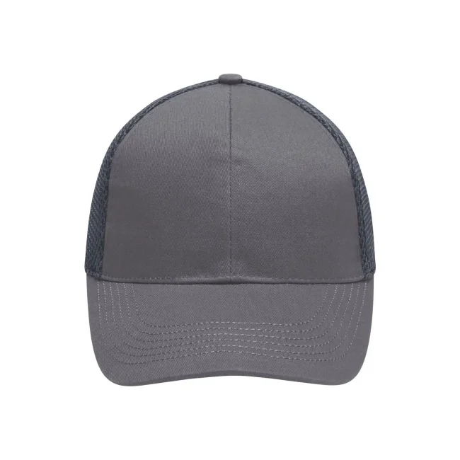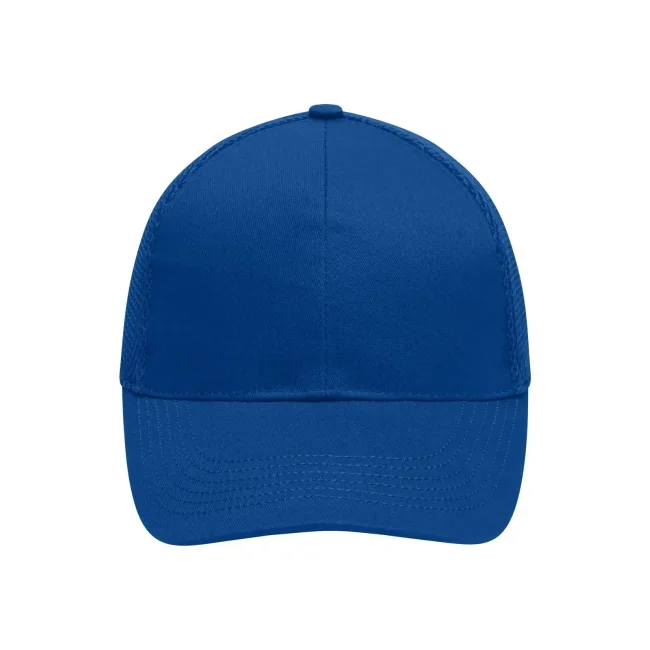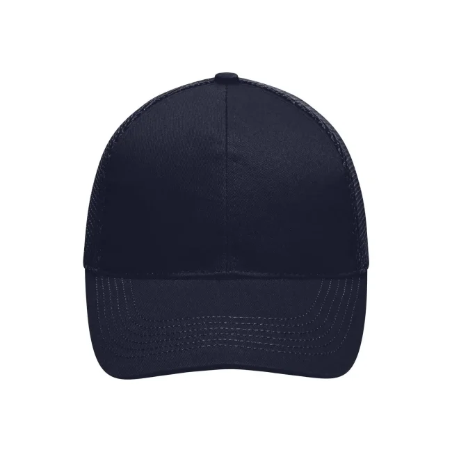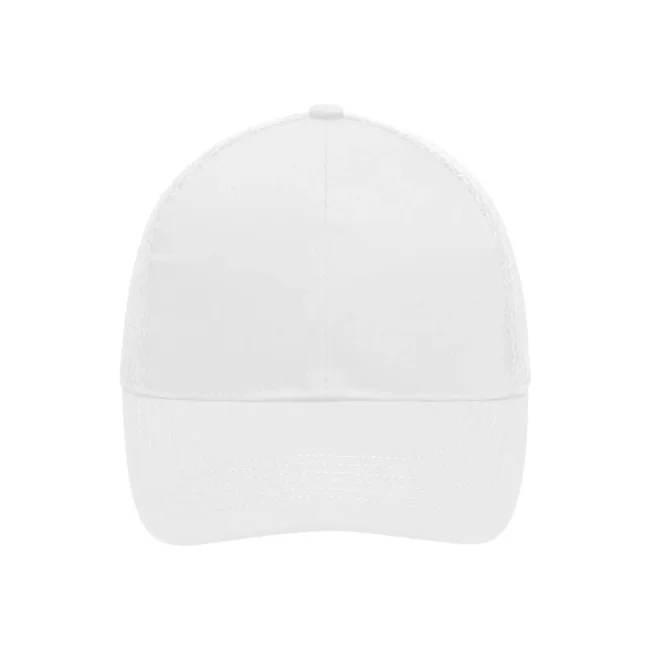 50% cotone, 50% poliestere. Cappellino a 6 pannelli, 6 cuciture decorative sulla visiera, pannelli frontali laminati, pannelli posteriori con tessuto traspirante, chiusura in velcro.
