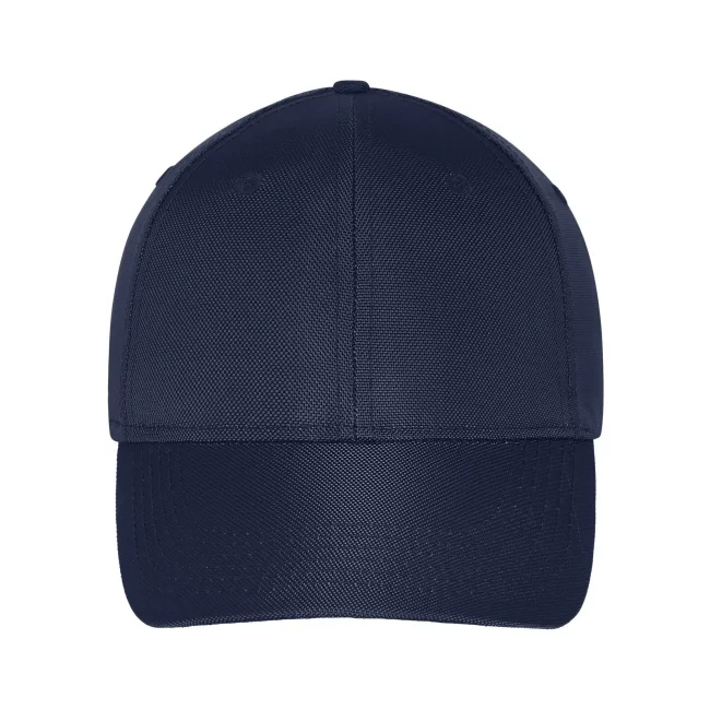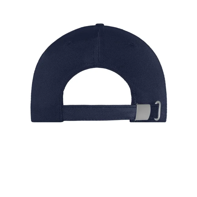 100% poliestere. Cappellino con 6 pannelli frontali laminati, 6 fori per l'aria ricamati, 6 cuciture decorative sulla visiera, fascia antisudore foderata, chiusura a clip in argento opaco con occhiello in metallo.