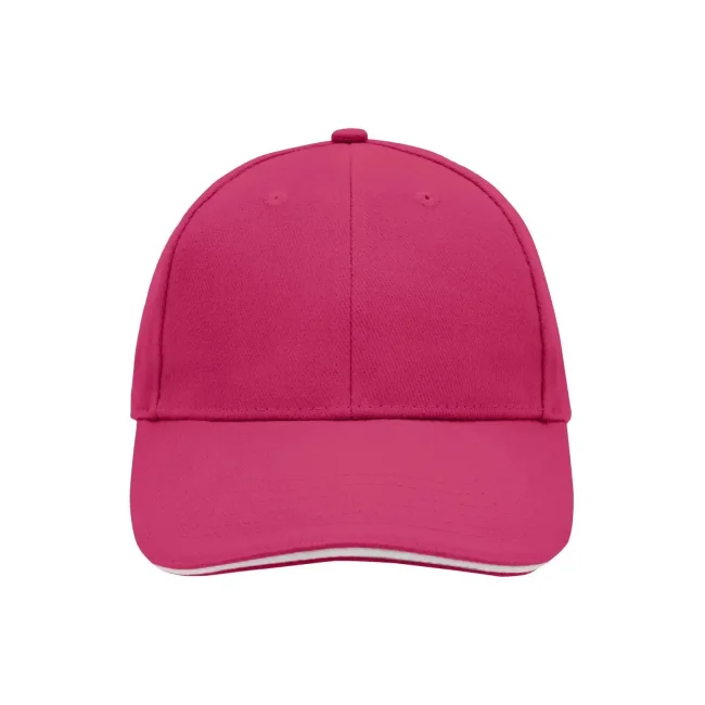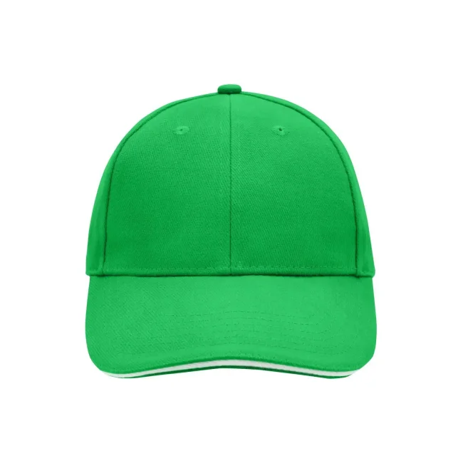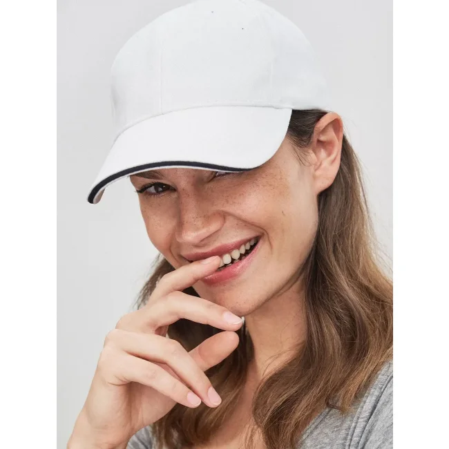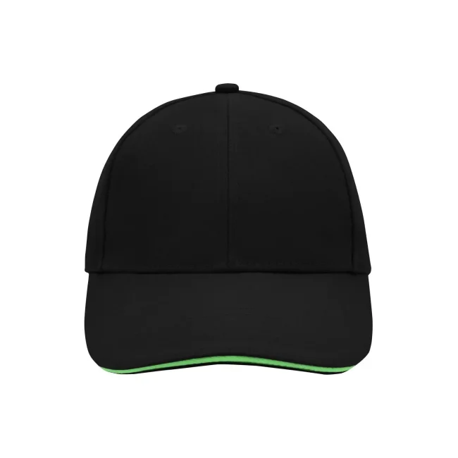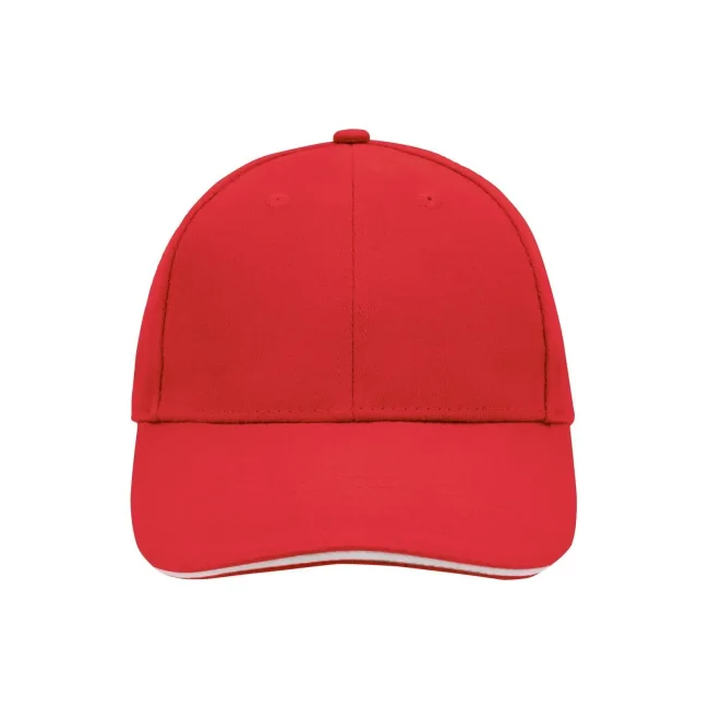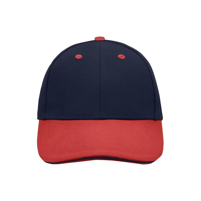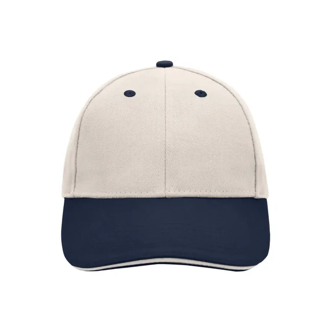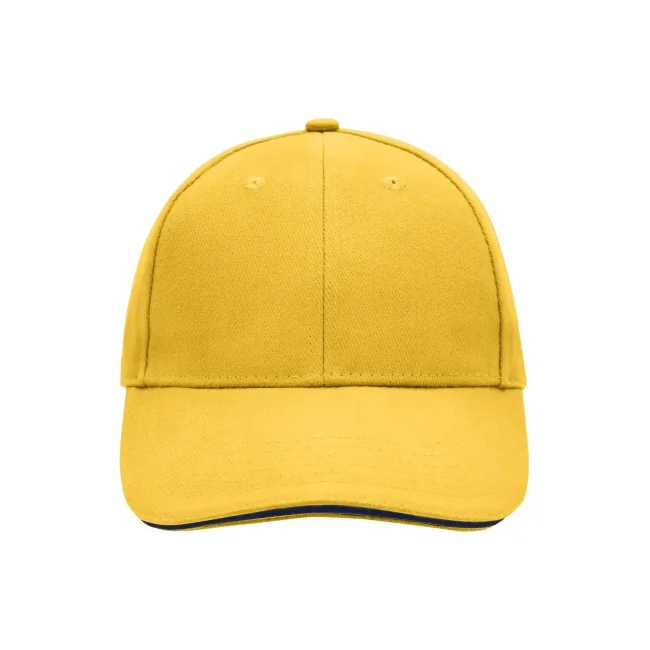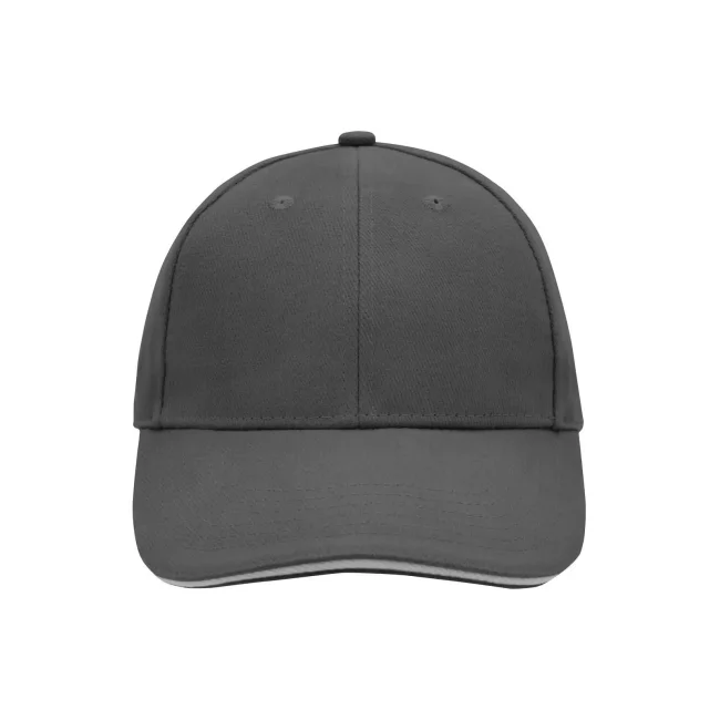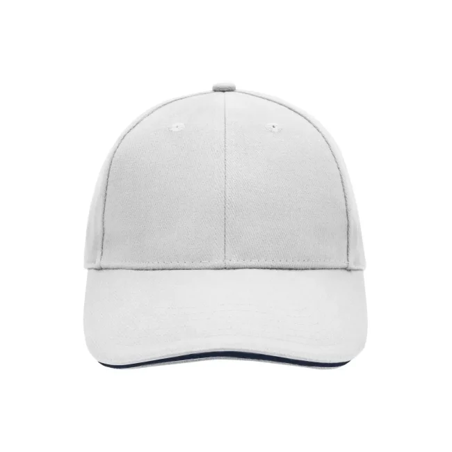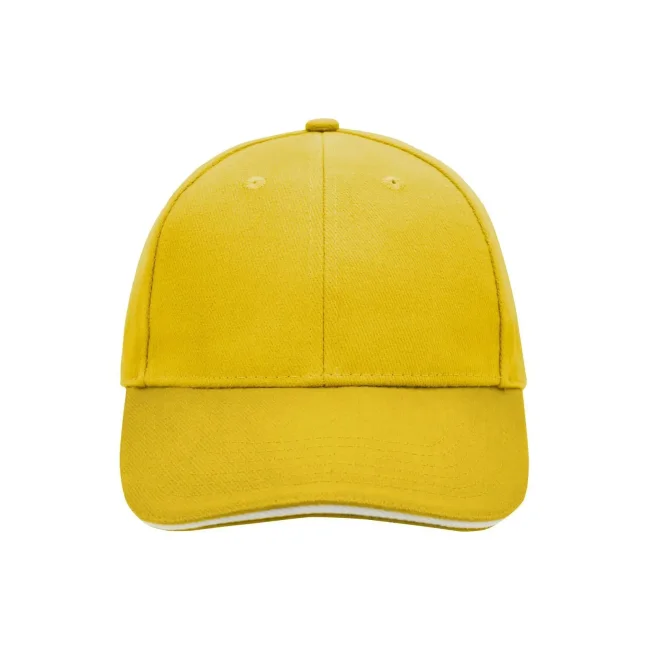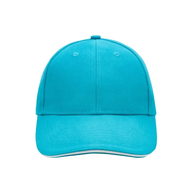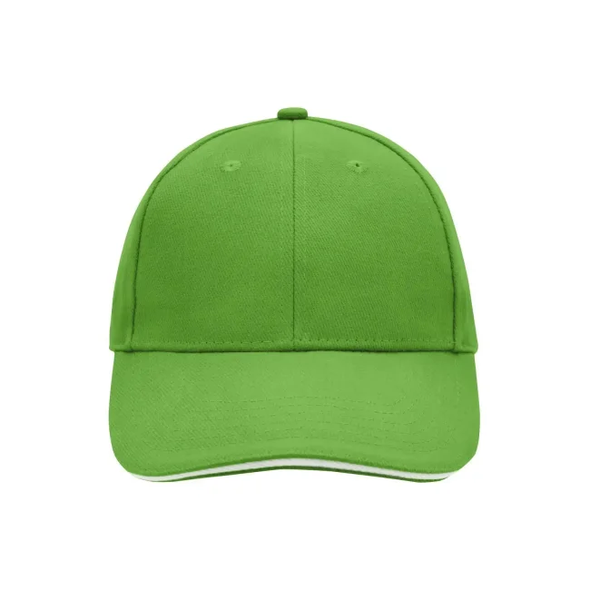 100% cotone. Cap sandwich in molte combinazioni colore, 6 fori traspiranti imbastiti, 6 cuciture decorative sulla visiera, pannelli frontali laminati. Fascetta tergisudore imbottita in satin, chiusura in metallo a clip con asola imbastita, Cotone spazzolato extra forte.