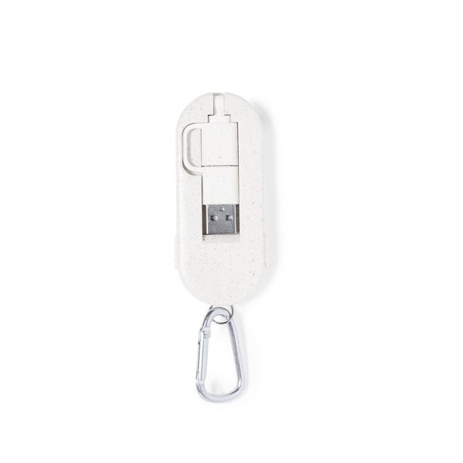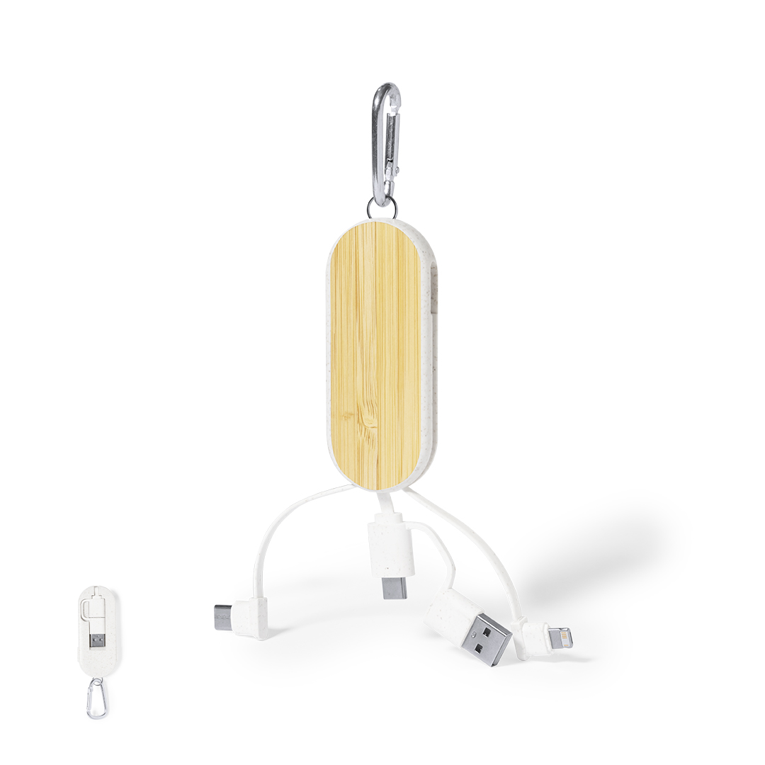 Cavo di ricarica con moschettone in fibra di grano e bambù. Con connessioni di ingresso Type-C e USB e uscite Type-C, lightning e Micro USB. 5V DC 2A. Presentato in un sacchetto di design kraft individuale.Realizzato con elementi di origine vegetale per promuovere l'utilizzo di materie prime naturali e ridurre le emissioni inquinanti.