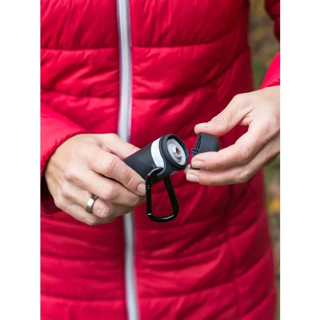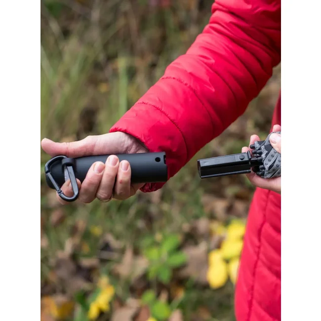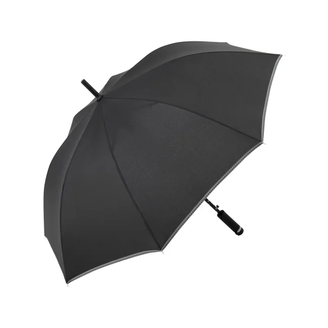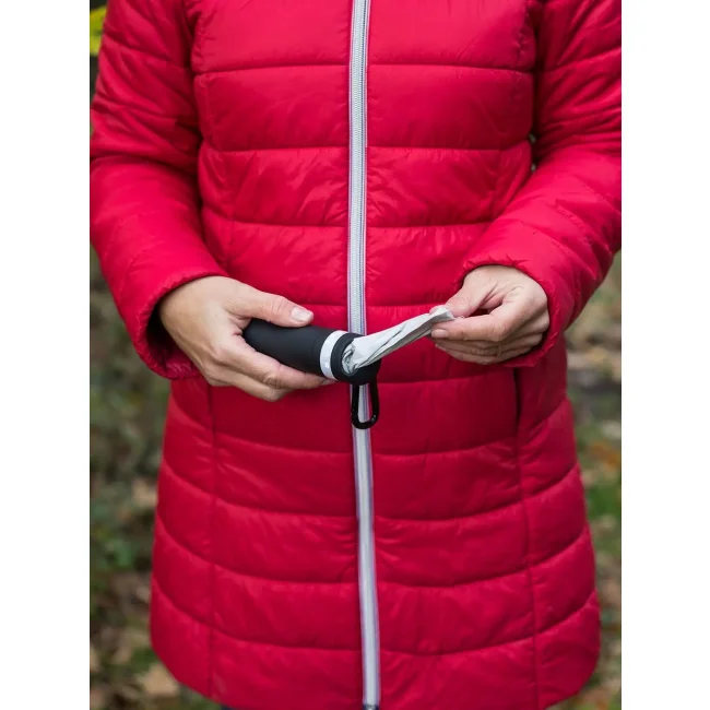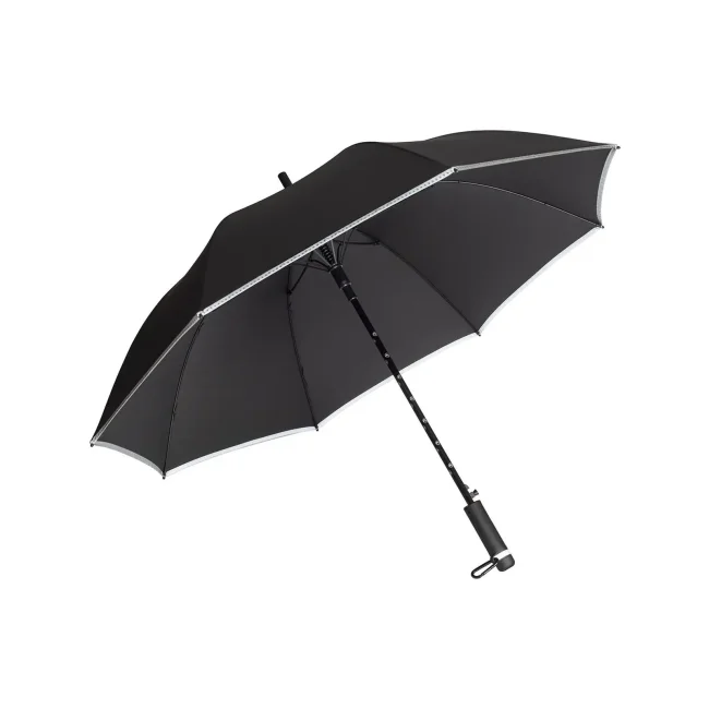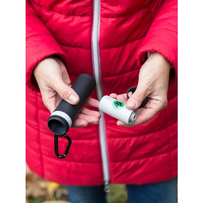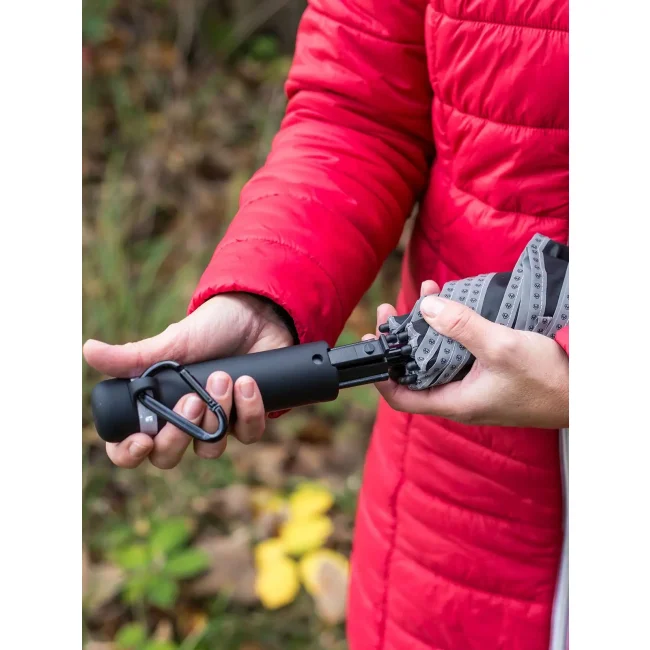 Copertura: 100% poliestere pongee, manico: plastica, asta: fibra di vetro. Ombrello automatico con manico amovibile con 15 sacchetti igienici per cani, ricaricabile, sistema Windproof e stecche in fibra di vetro, bastone decorato con impronte di zampe in argento, strisce riflettenti sul bordo, manico con gancio a moschettone, tasto di apertura personalizzabile. Diametro: 120 cm, lunghezza da chiuso: 94 cm, 8 pannelli.
