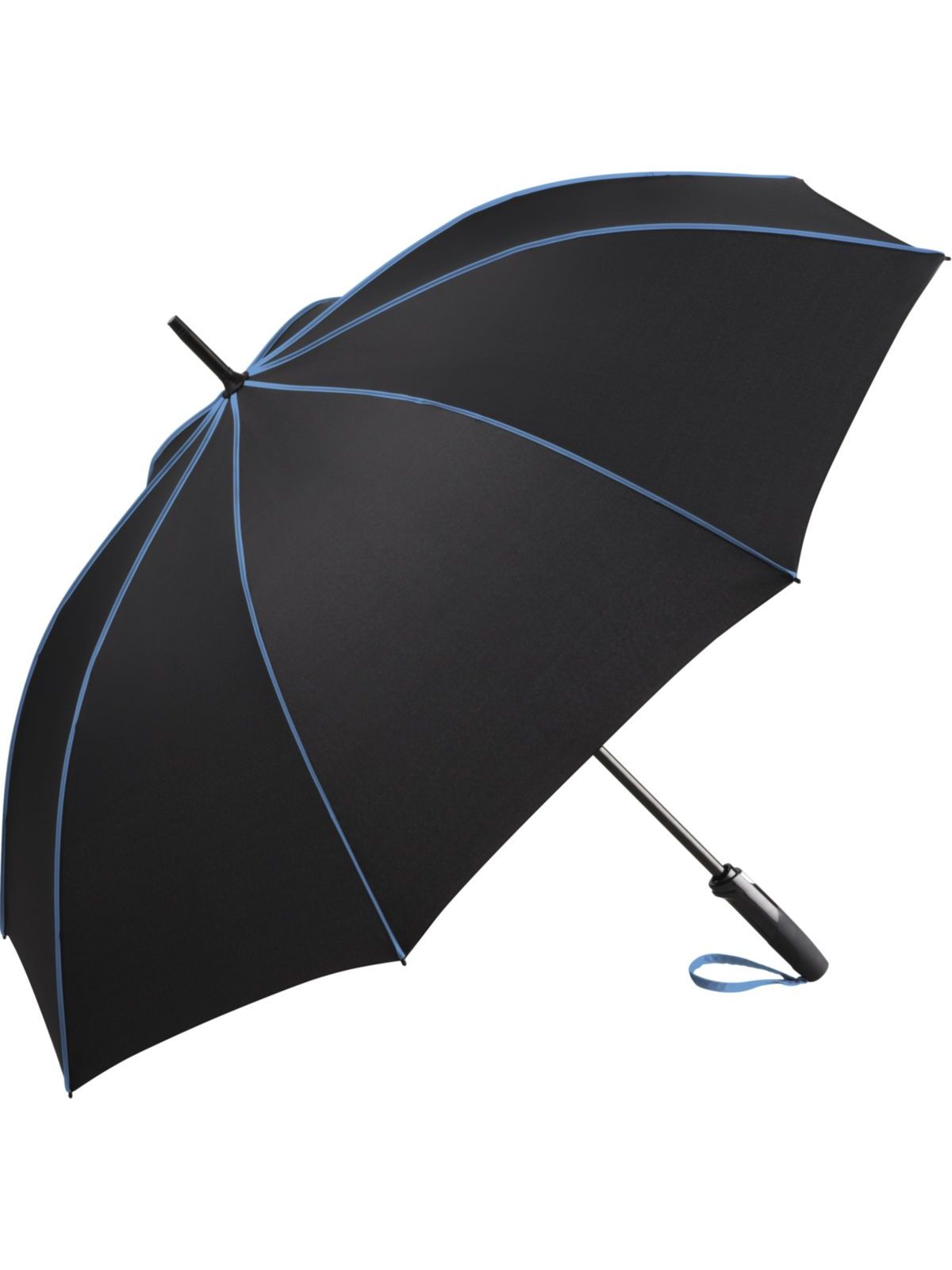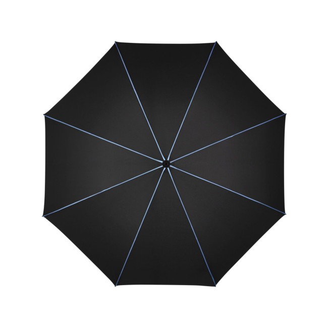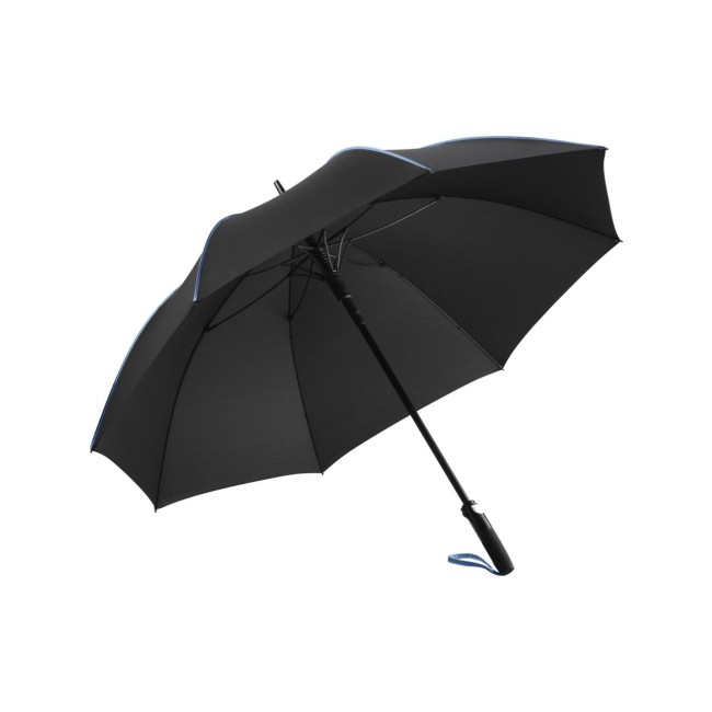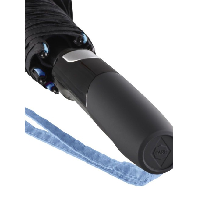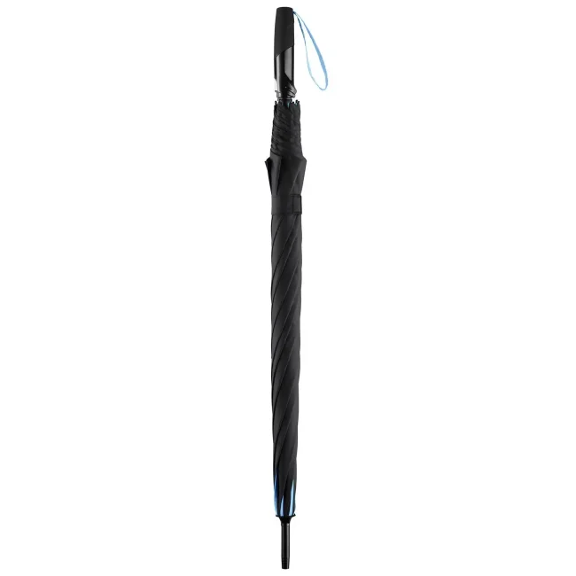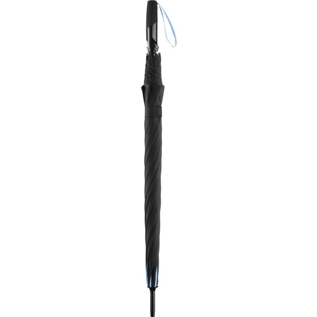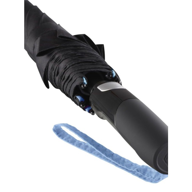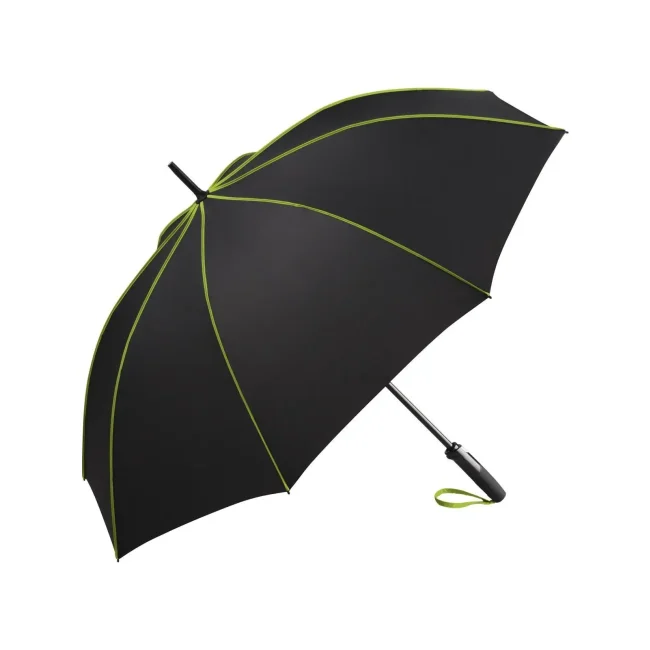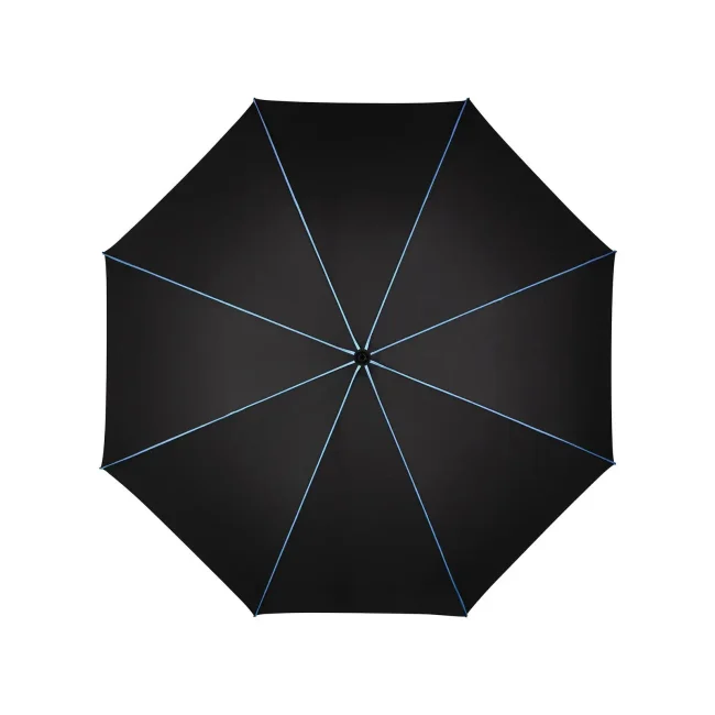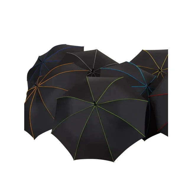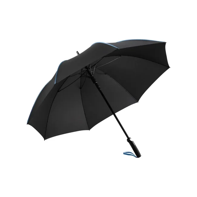 Copertura: 100% poliestere, manico: plastica, asta: acciaio, plastica. Ombrello di media misura con apertura automatica, bacchette flessibili in fibra di vetro, pannelli di colore nero con bande in contrasto colorate, manico nero soft-touch. Diametro: 115 cm, lunghezza da chiuso: 90 cm, 8 pannelli.