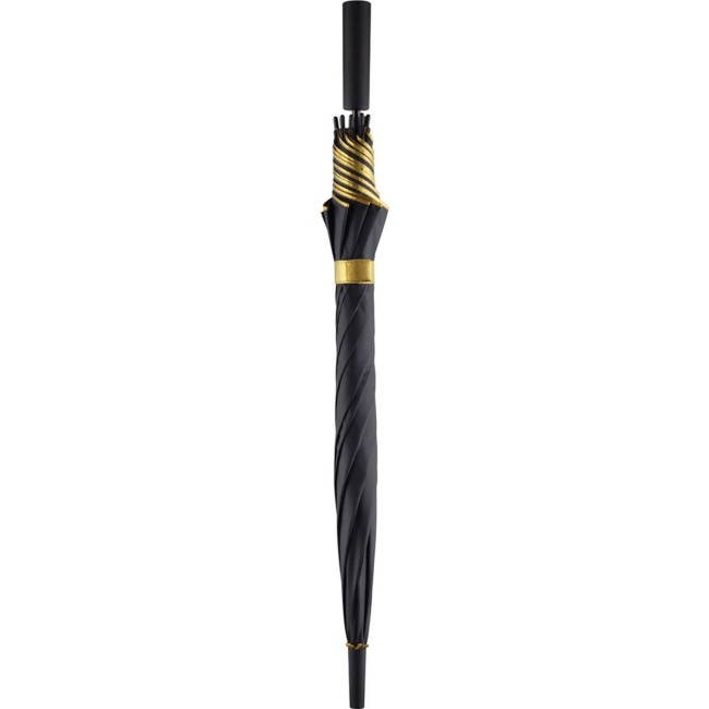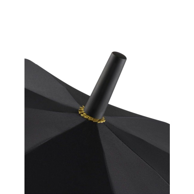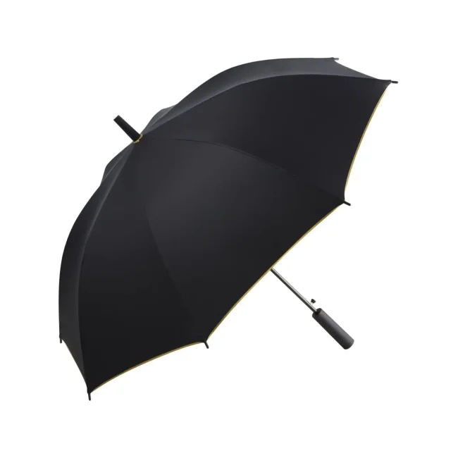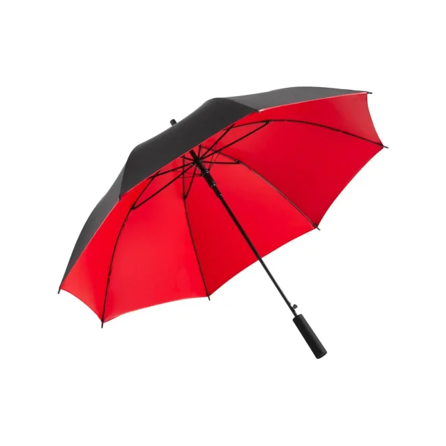 100% poliestere. Colori della fodera interna ed esterna combinati in modo armonioso, con dettagli a contrasto, orlo, bordo e chiusura in velcro abbinati ai colori della fodera interna, stecche in fibra di vetro stabili, confortevole funzione automatica per un'apertura rapida, proprietà Windproof per una maggiore flessibilità del telaio e migliore resistenza al vento, manico soft-touch piatto con doppia possibilità di applicazione della pubblicità, maggiore protezione dalla corrosione grazie alla galvanizzazione nera del bastone in acciaio. Diametro: 105 cm, lunghezza da chiuso: 80 cm, 8 pannelli.