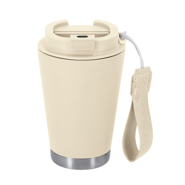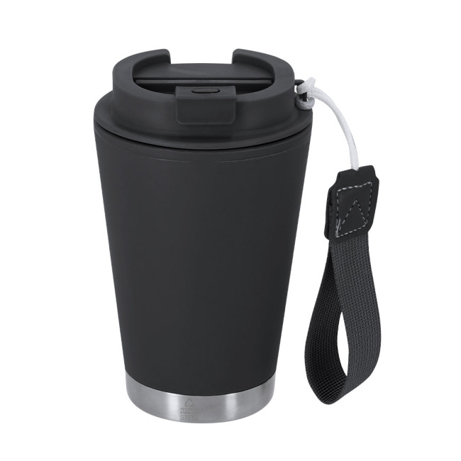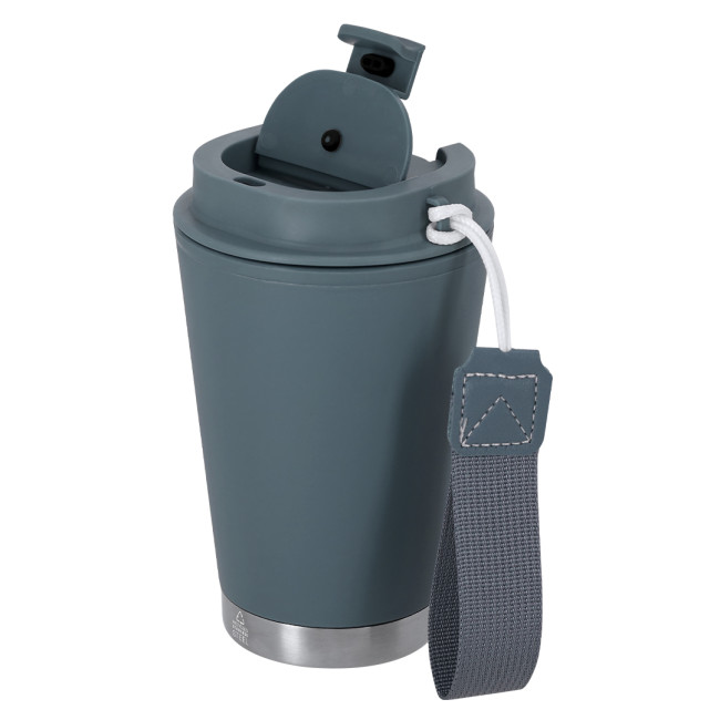 Coppa termica con una capacità di 300 ml, realizzata in acciaio inossidabile riciclato e PP riciclato con doppia parete. Ha un coperchio di sicurezza per una chiusura ermetica. Include un manico in poliestere pratico per un trasporto facile senza BPA. Include il distintivo in acciaio inox riciclato.