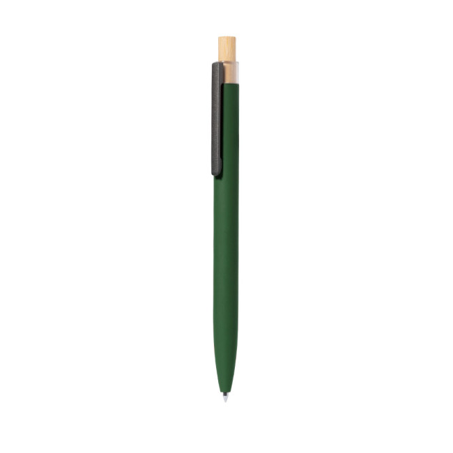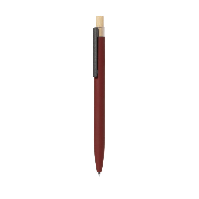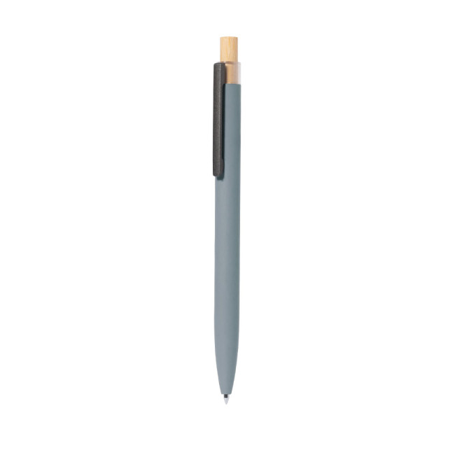 Biro con meccanismo a pulsante realizzata in alluminio riciclato. Pulsante in bambù e fusto gommato, disponibile in una gamma di colori eleganti. Clip metallica e caratteristico cappuccio in alluminio riciclato sulla parte superiore della penna. Cartuccia Jumbo con inchiostro blu. Presentata singolarmente in polybag riciclata.
