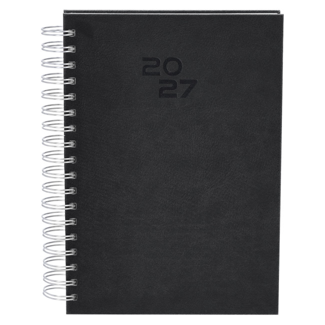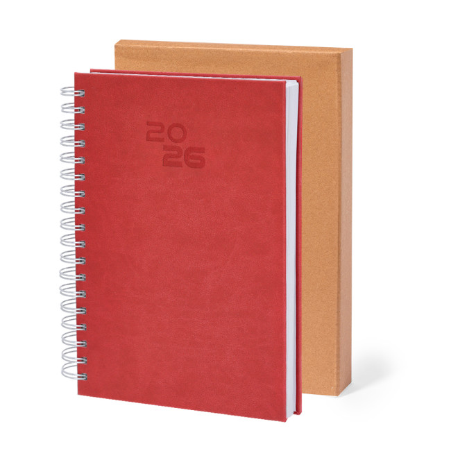Agenda ad anelli formato B5 in morbida pelle PU, dotata di copertine rigide. Include una scatola di presentazione in kraft e un design a pagina giornaliera con pagine con angolo fustellato. Disponibile in due lingue: spagnolo e inglese.