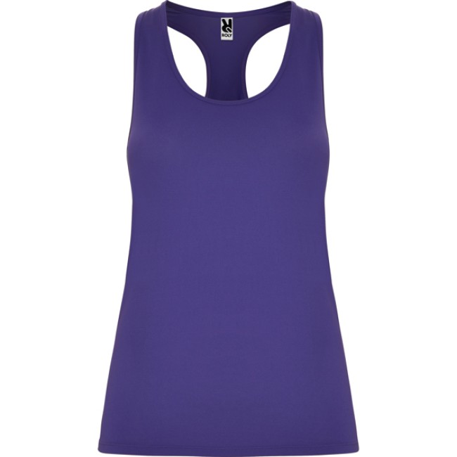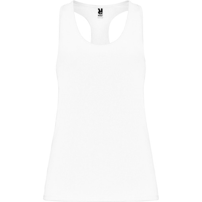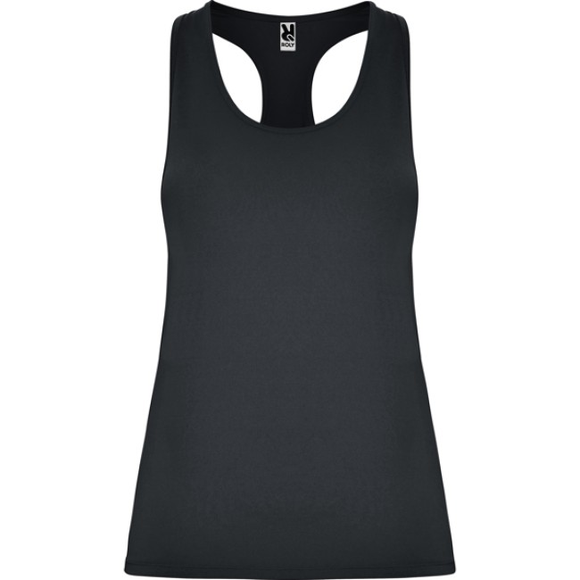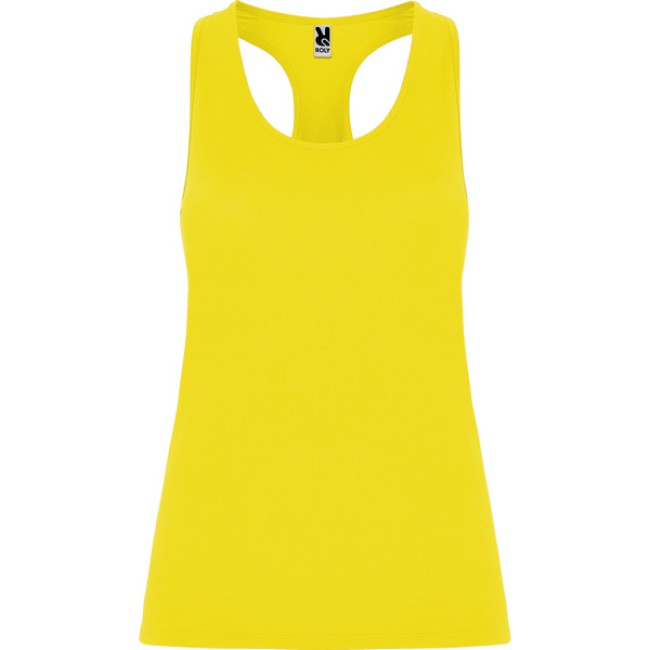 Canotta sportiva con spalline incrociate. Tessuto poliestere tatto cotone. Tessuto adattabile al corpo. Taglio aderente.