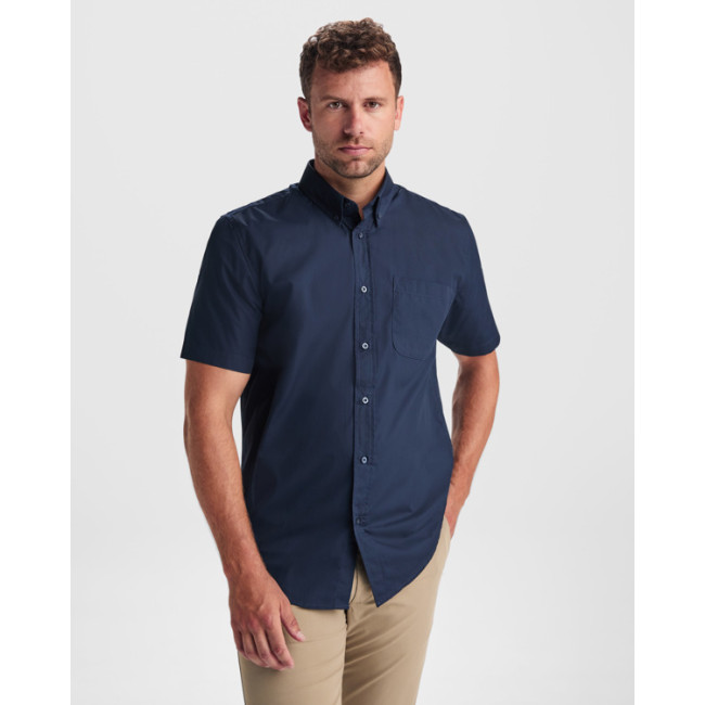 Camicia a maniche corte. · Colletto classico a camicia.· Cuciture in avanti sulle spalle.· Carré sul retro.· Tasca sul petto a sinistra.· Pattina di abbottonatura tono su tono. - Orlo arrotondato.