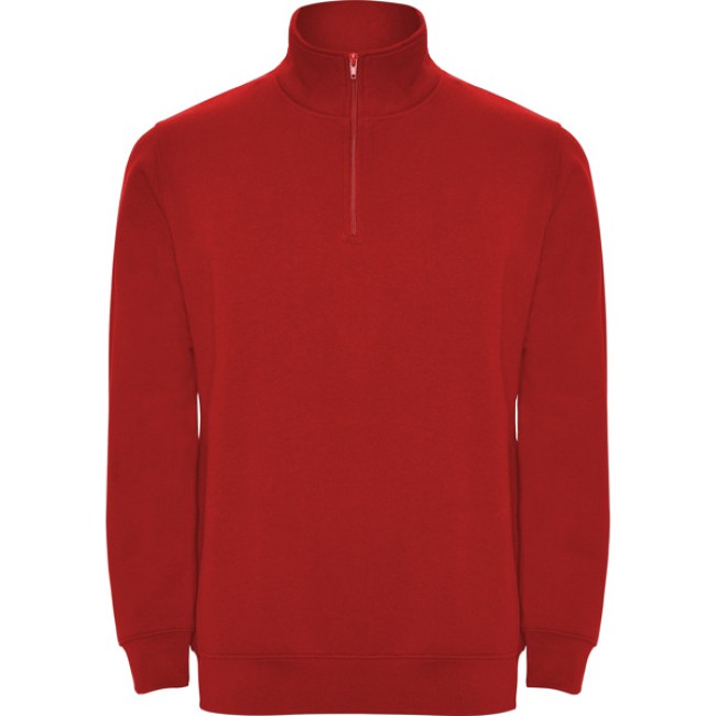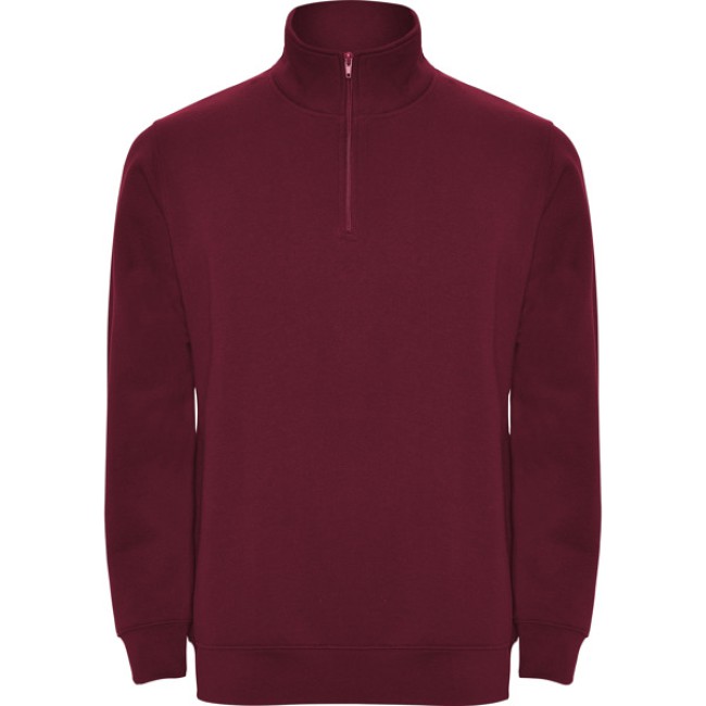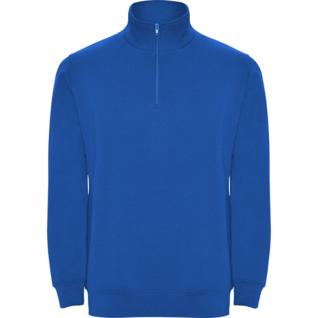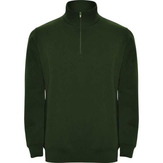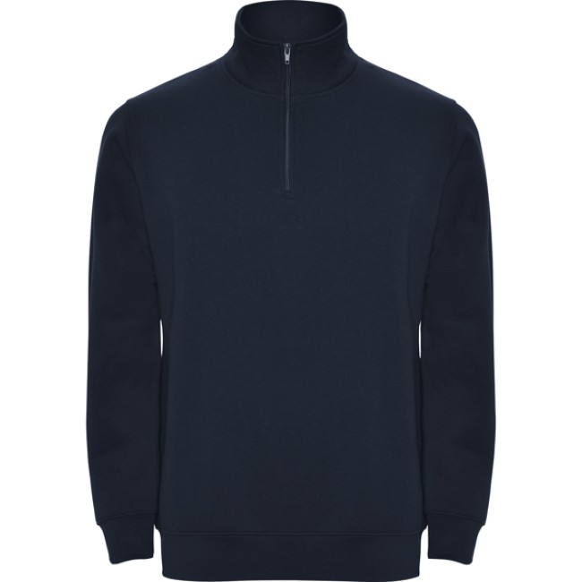 Felpa con mezza cerniera in tinta e collo alto. Parte interna del colletto nello stesso colore. Copri cuciture rinforzate all'interno del collo. Costine 1x1 nei polsini e nel girovita.