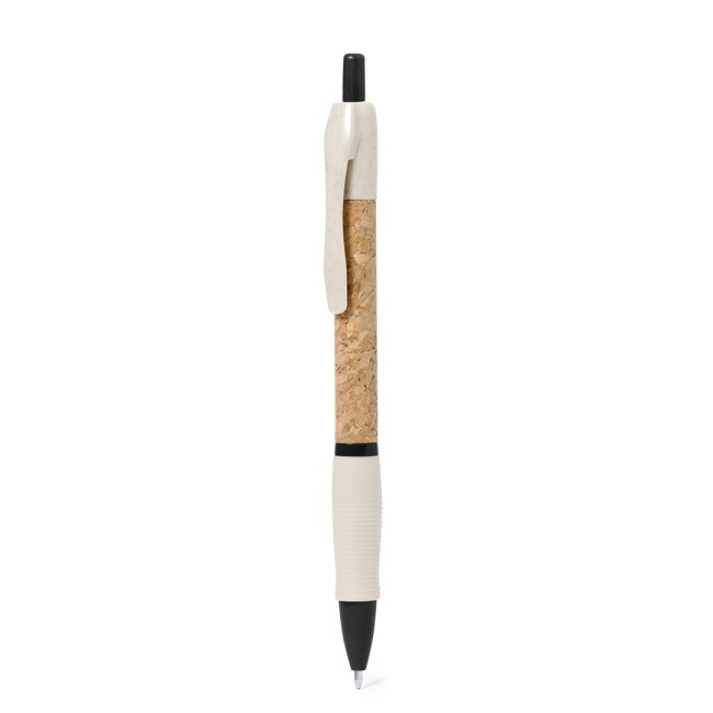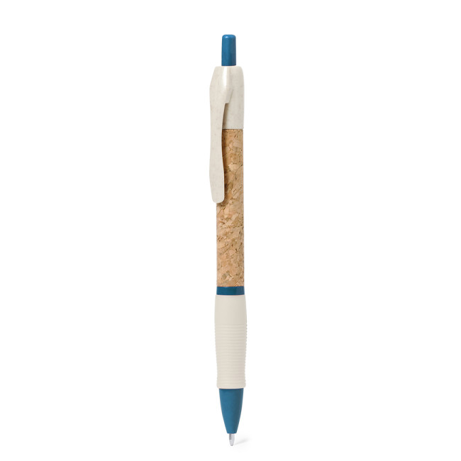 Penna con meccanismo a pulsante e fusto in sughero naturale. Clip, punta e pulsante in fibra di grano. Disponibile in una gamma di colori. Distintivo Wheat Straw sulla parte superiore della penna. In inchiostro blu.Realizzata con elementi di origine vegetale, promuovendo così l'uso di materie prime naturali e riducendo le emissioni inquinanti."
