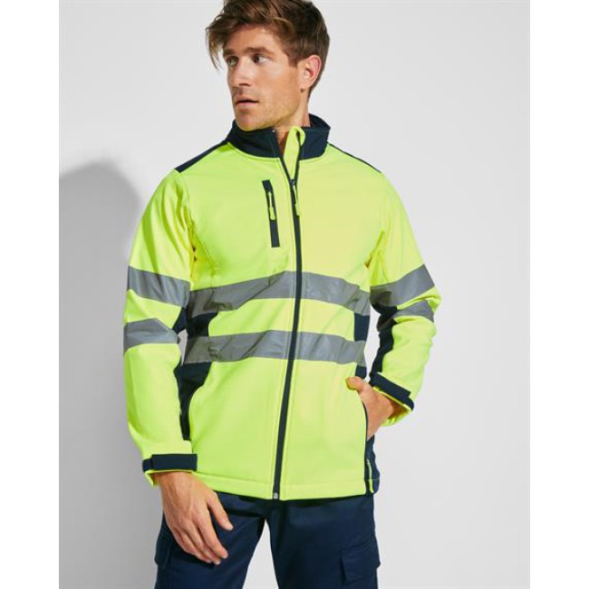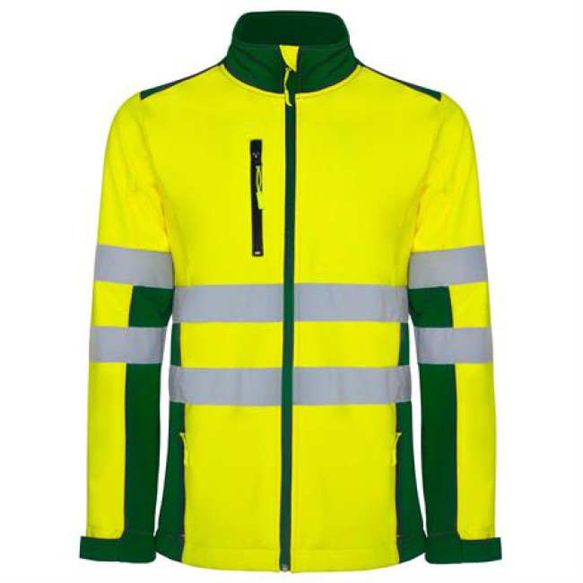 Soft shell bicolore ad alta visibilità.· Bande riflettenti sul petto e sulla manica.· Collo alto, cerniera centrale.· Velcro di chiusura sui polsini.· Elastico interno nel girovita con coulisse di chiusura.· Tre tasche esterne e due interne.