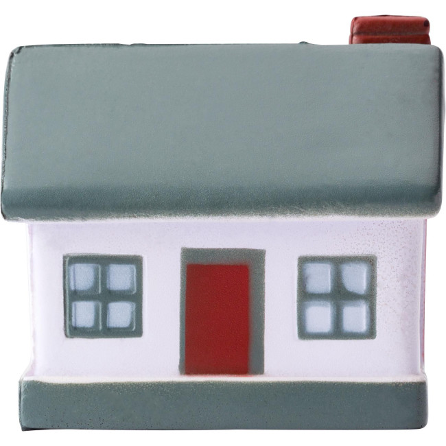 Antistress a forma di casa, in PU. Gli articoli antistress possono essere stampati solo nei colori nero, bianco, oro o argento.