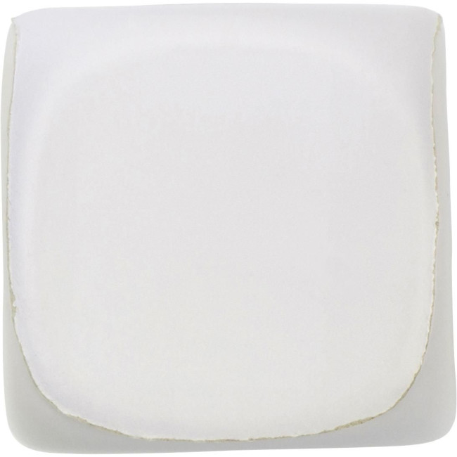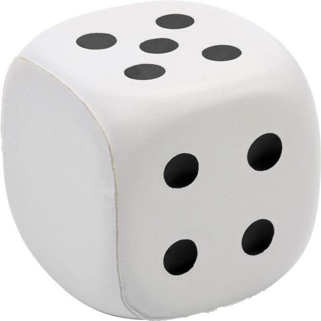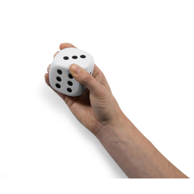 Antistress a forma dado, personalizzabile su di un lato, in PU. Gli articoli antistress possono essere stampati solo nei colori nero, bianco, oro o argento.
