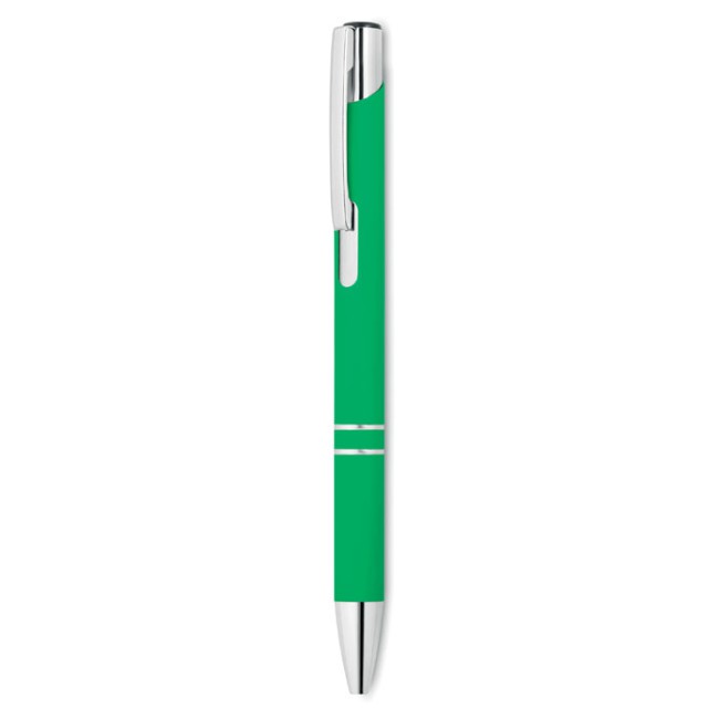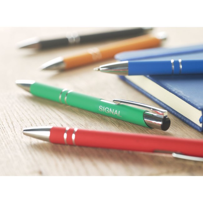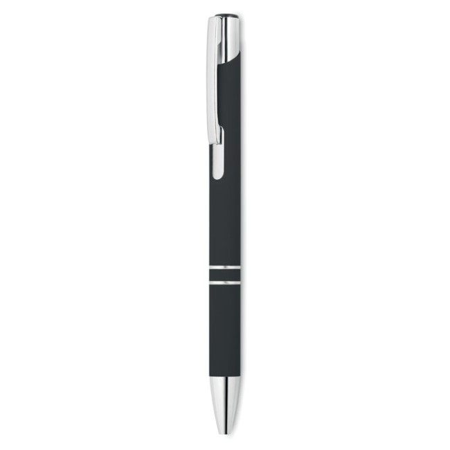 Penna a sfera con finitura gommata e specchiata. L’effetto specchiato viene via con la stampa laser. Inchiostro blu.