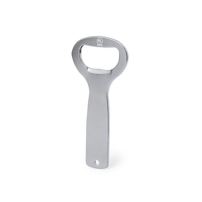 Apribottiglie in alluminio caratterizzato da un manico fustellato per un facile appendimento. Progettato per la stampa laser, è disponibile in una gamma di colori vivaci. Presentato in un sacchetto di carta riciclata, è un accessorio pratico e sostenibile.