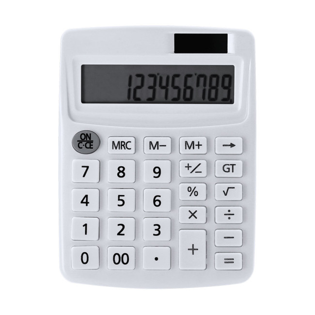 Calcolatrice a 12 cifre realizzata in ABS resistente, con tasti touch soft. Doppio funzionamento con energia solare e alimentazione ausiliaria con batteria a pulsante (inclusa). Schermo LCD e meccanismo di spegnimento automatico.