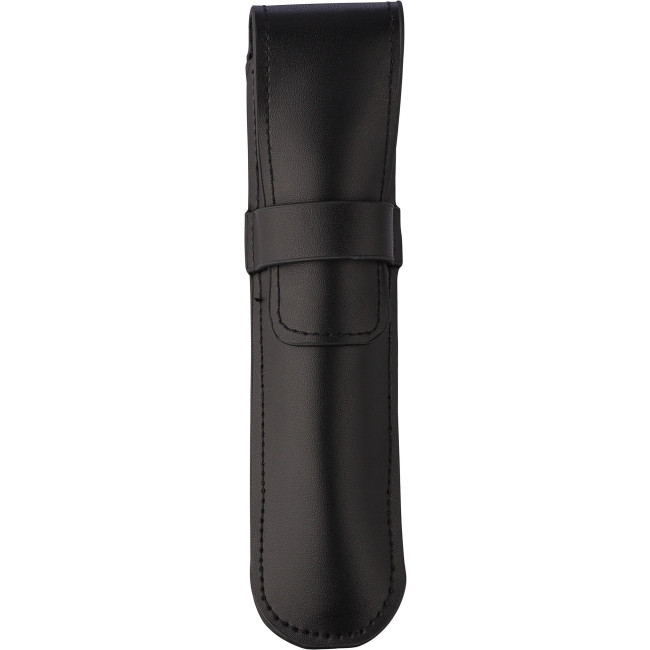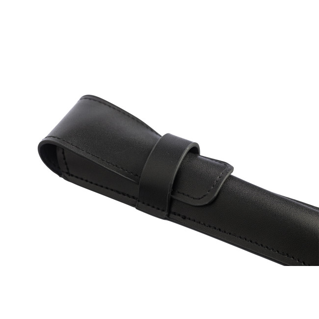 Astuccio portapenne in vero cuoio a due strati, con patta e chiusura a cinturino. Interno in morbido velluto. Confezionato singolarmente in un elegante astuccio in cartone nero.