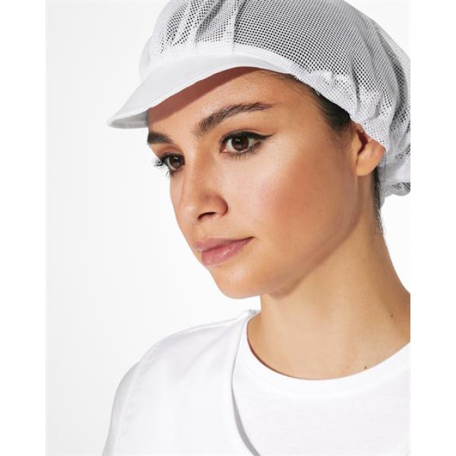 Copricapo con modello migliorato. · Rete per capelli e visiera rigida. · Pieghe sul davanti. · Rete traspirante con elastico adattabile nella parte posteriore.