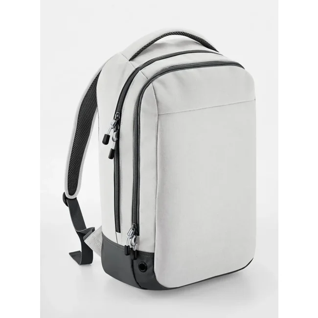 100% Poliestere combinato 600D/420D. Zaino in tessuto impermeabile, ampia apertura con zip, tasca frontale sezione organizer, tasca interna a sacchetto, tasca esterna per bottiglie. Supporto per cuffie wireless. Pannello posteriore imbottito e traspirante, spallacci ergonomici, manico imbottito. Etichetta TearAway. Cm 30x50x18, 23 Litri. Area stampa cm 20x30.