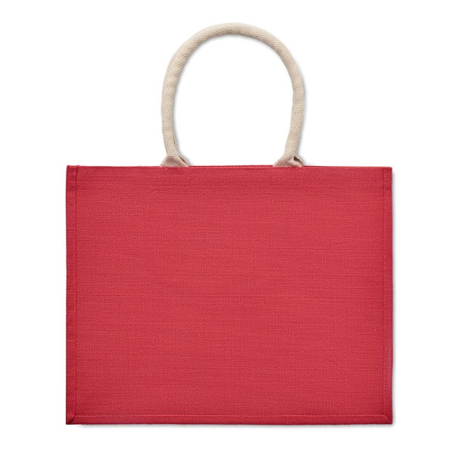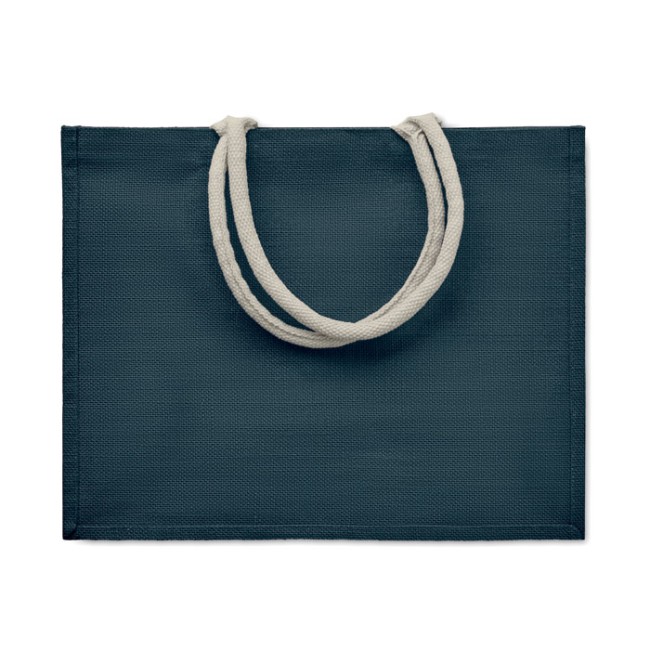Shopper o borsa da spiaggia in iuta laminata con manico in cotone. Manici corti. Questo prodotto è certificato OEKO-TEX® STANDARD 100.