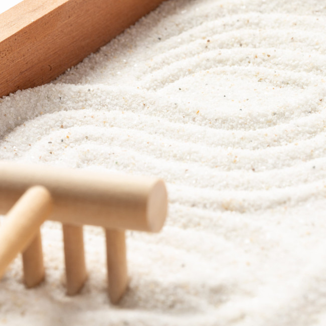 Mini giardino zen per il relax e la pace interiore. Base del contenitore e rastrello in legno naturale, con 4 pietre naturali e un sacchetto di sabbia bianca. Confezionato in una scatola individuale di design in kraft.