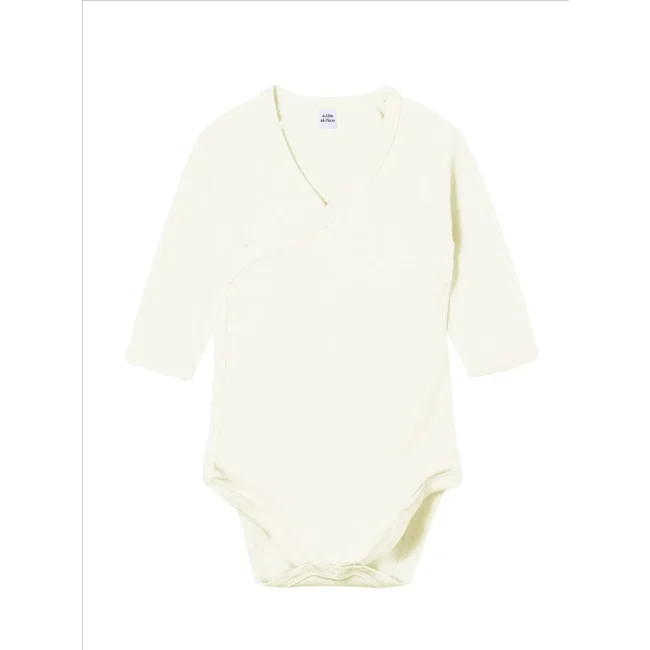 100% cotone organico. Body da neonato incrociato stile kimono, con bottoni automatici nickel-free al collo e al cavallo. Bordino intorno a collo, alle estremità delle maniche e al cavallo per mantenere la forma dell'indumento. Maniche lunghe raglan. Etichetta taglia removibile al collo. Etichetta con istruzioni di lavaggio in cotone organico.