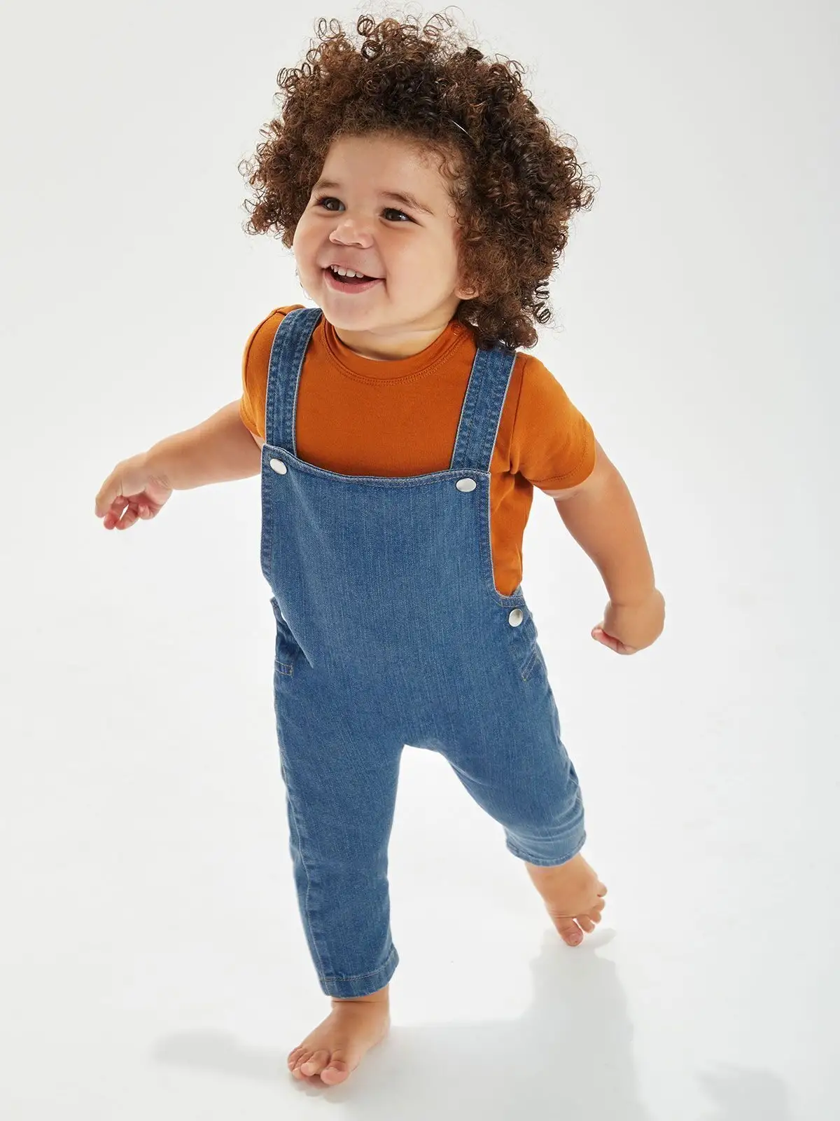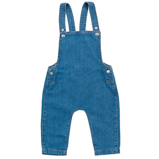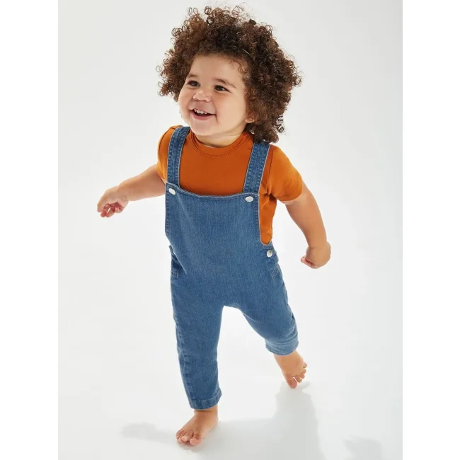 100% cotone organico OCS. Baby salopette in denim con cinturini con bottoni automatici regolabili, nessuna cucitura centrale davanti o dietro per una maggior superficie decorabile, cavallo basso, chiusura con bottoni automatici ai lati, cuciture stile jeans, etichetta a strappo.