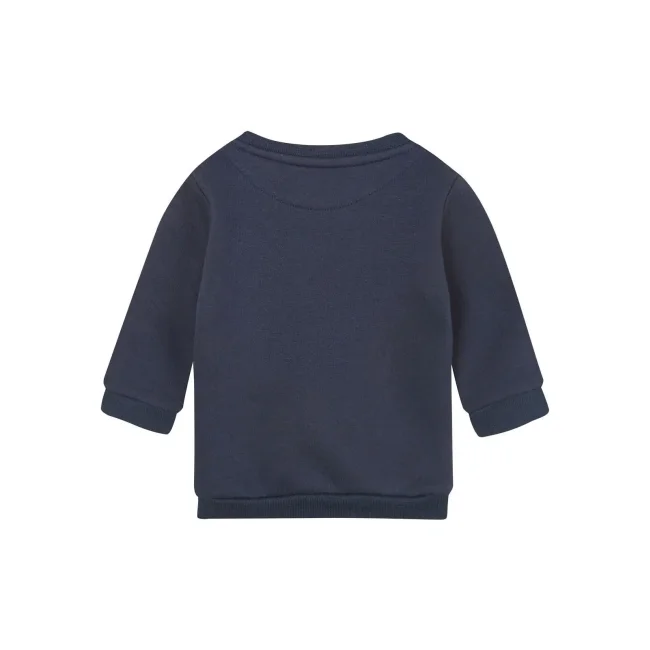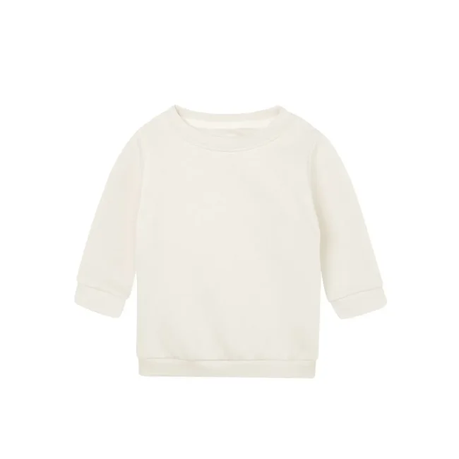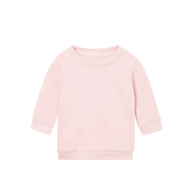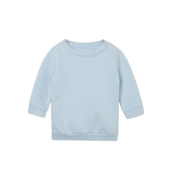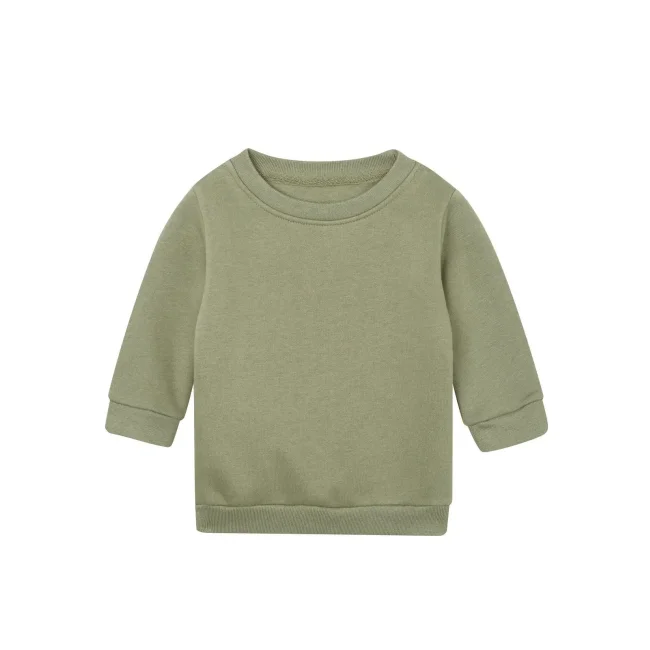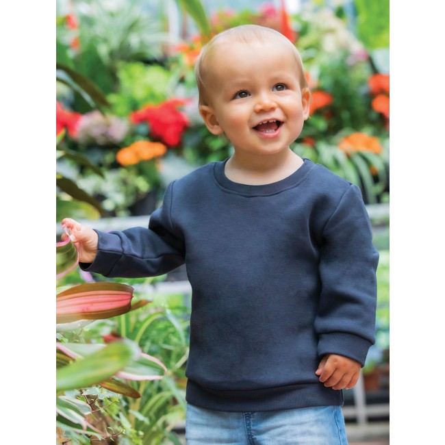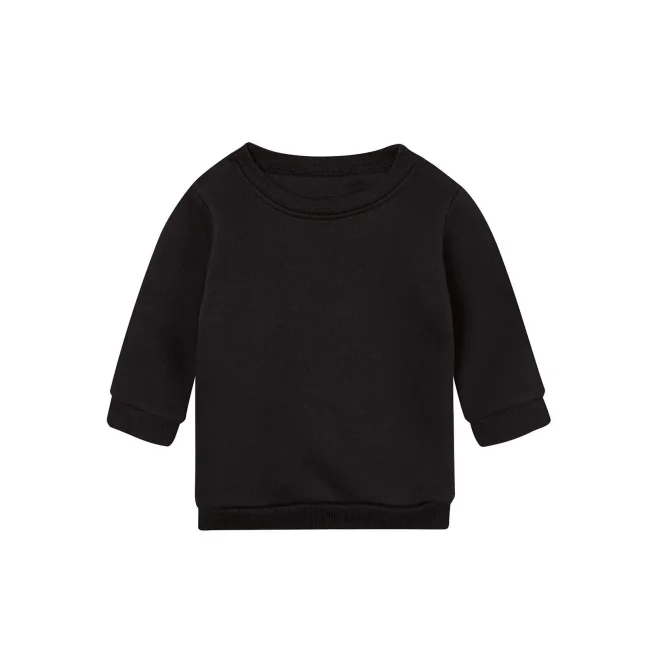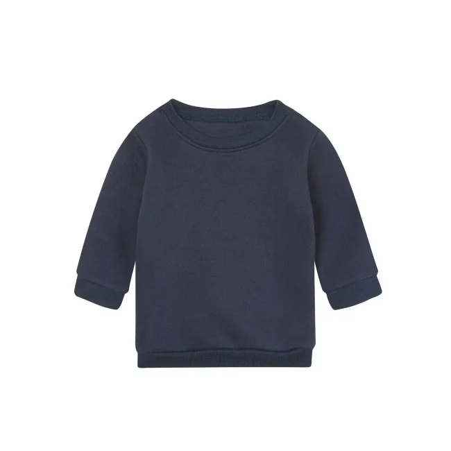 80% cotone (organico o in conversione), 20% poliestere riciclato, 280 g/m2. Felpa girocollo da neonato con interno felpato, maniche set-in, nastro di rinforzo al collo a contrasto. Girocollo, polsini e orlo a costine. Etichetta taglia removibile sul collo. Etichetta con istruzioni di lavaggio in cotone organico.