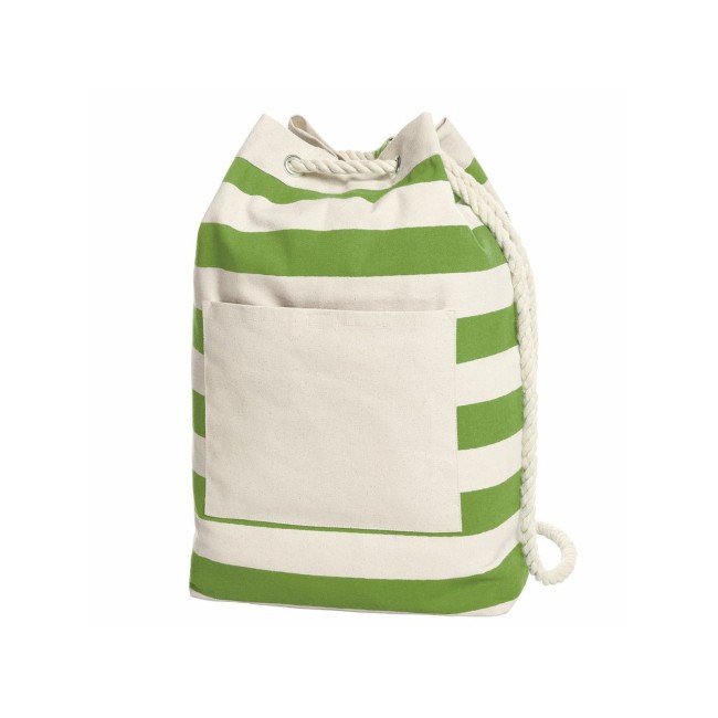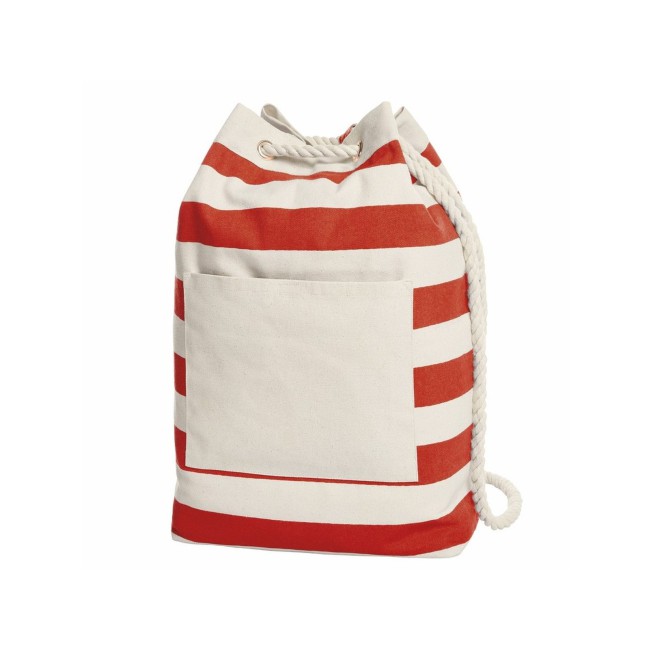 100% cotone. Sacca con decoro a strisce, spaziosa, con retro rigido, ampia tasca anteriore con chiusura in velcro, occhielli decorativi e tracolla in corda spessa di cotone. Area stampabile sulla tasca frontale: 17 x 13 cm. Dimensioni: 30 x 48 x 15 cm. Capacità: 22 litri.