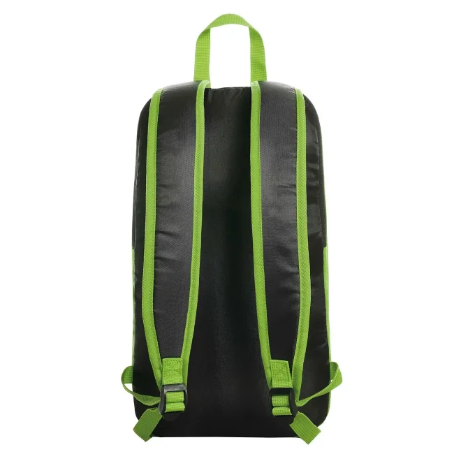100% poliestere 600d. Zaino leggero e sportivo, con tasca anteriore con chiusura lampo, scomparto principale, retro e spallacci imbottiti. Area di stampa sulla tasca frontale: 8 x 17 cm. Dimensioni: 23,5 x 41 x 10 cm. Capacità: 8 litri.