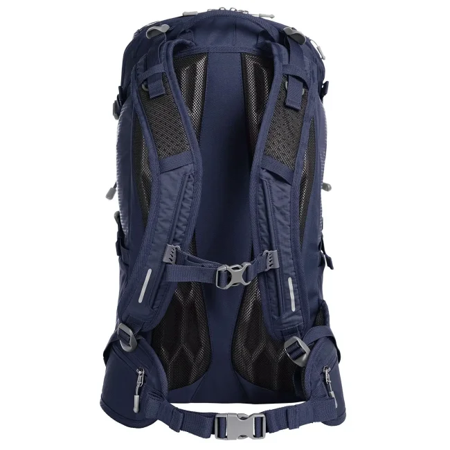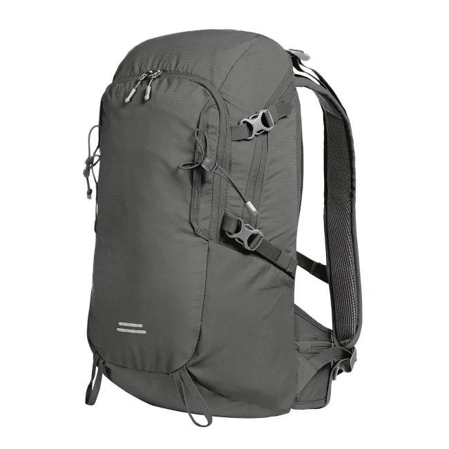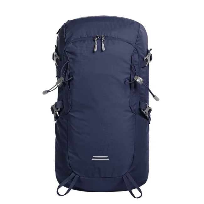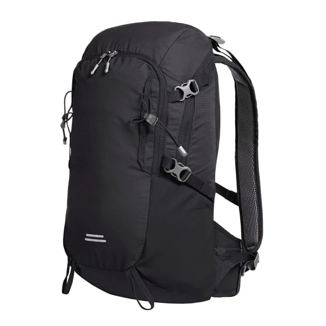 100% RPET 150D/600D Ripstop. Zaino leggero e funzionale, schienale imbottito con sistema a nido d'ape, regolabile in altezza. Cinturino al torace regolabile, cinturino addominale con tasche, scomparto principale con zip bidirezionale e tasca a inserto piatta, uscita posteriore per cuffie, diverse tasche fascia con cinghia Molle sulla tasca anteriore, stampa riflettente decorativa. Fissaggi per bastoni da trekking, tasca sul fondo con copertura antipioggia, manico.