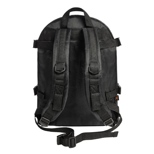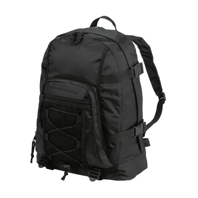 100% nylon 420d. Zaino con scomparto principale con cinghie, due tasche frontali con cerniera, schienale imbottito, inserti in rete e corda. Dimensioni: 30 x 41 x 14 cm, capacita': 23 litri, area di stampa: 10 x 6 cm.