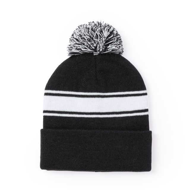 Caldo e morbido berretto in materiale acrilico in una varietà di colori. Design originale, con striscia frontale bianca e pom pom bicolore abbinato.