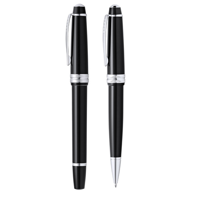 Set di penne biro e roller Bailey Light Cross, che combina una resina lucida con finiture metalliche cromate lucide. Cartuccia Jumbo e inchiostro nero. Confezionato in un elegante astuccio nero individuale con logo Cross e fodera in morbida pelle scamosciata.