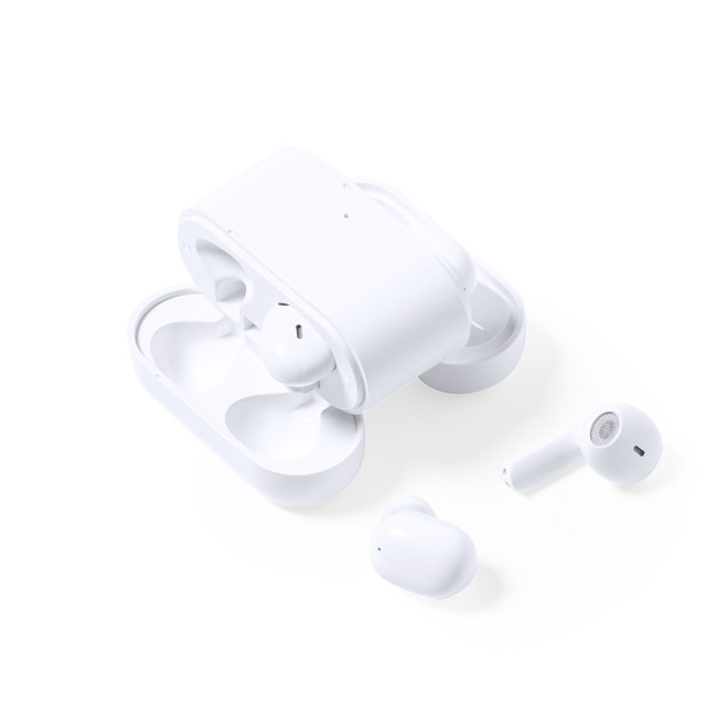 Custodia con 2 set di auricolari in elegante finitura bianca con 2 diversi design ergonomici. Connessione Bluetooth® 5.0, con pulsante di controllo a sfioramento integrato nelle cuffie, base di ricarica abbinata e indicatori di stato di carica. Funzione vivavoce e ricaricabile via USB. Presentati in una scatola dal design accattivante.