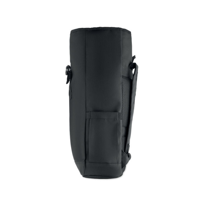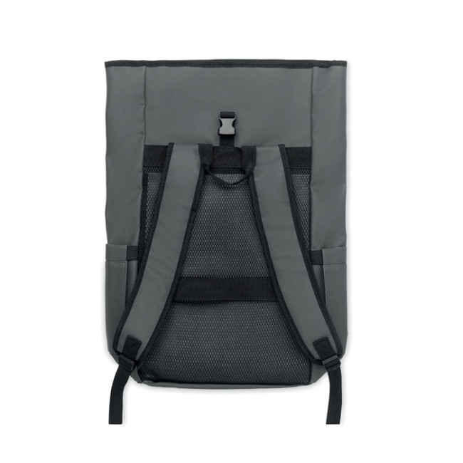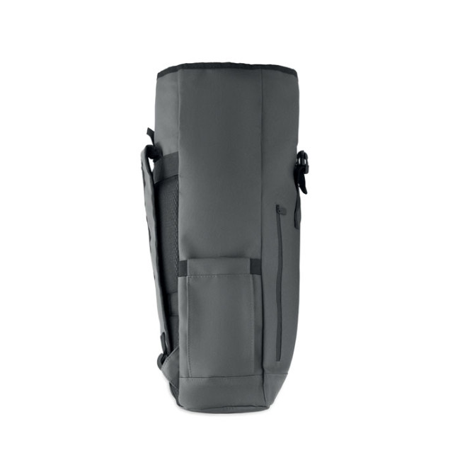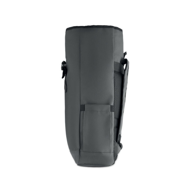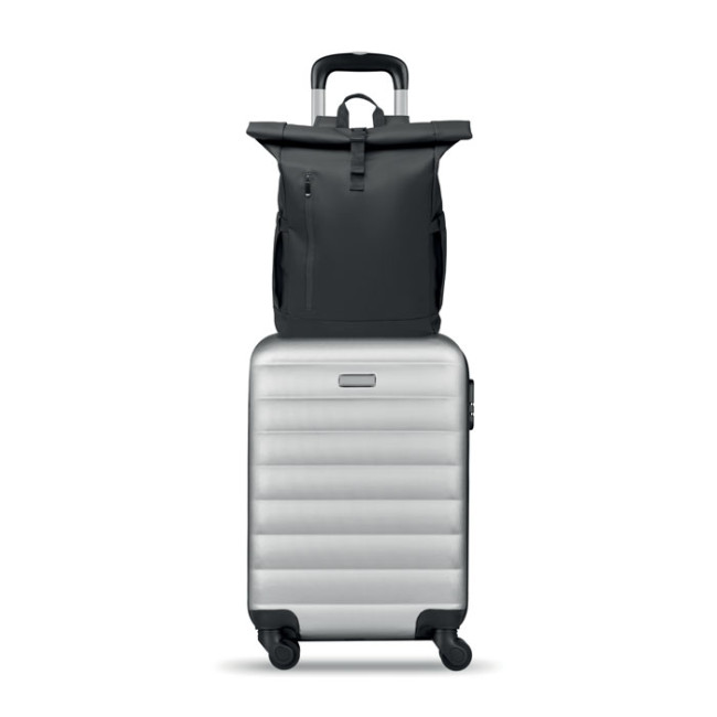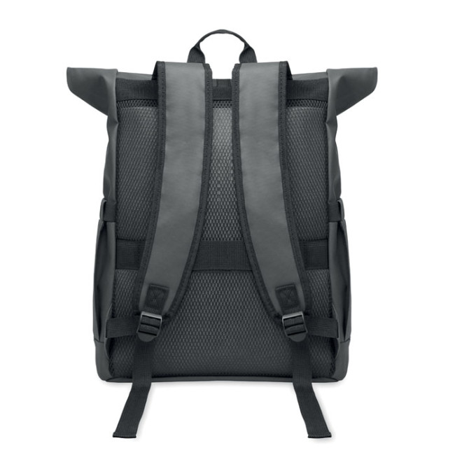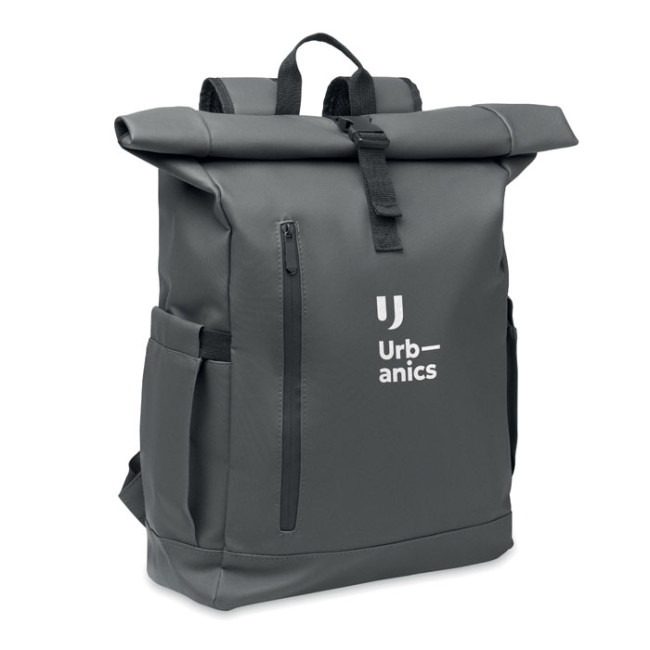 Zaino rolltop per laptop in poliestere 600D RPET rivestito in PU e fodera in poliestere RPET. Schienale imbottito in rete con tasca con cerniera e cinghia trolley. Tracolla imbottita con finitura interna in rete.