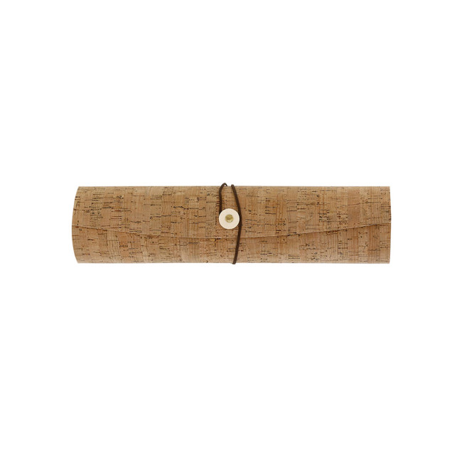 Scatola di presentazione con interno in legno naturale e rivestimento esterno in sughero. Include chiusura con cinghia marrone.