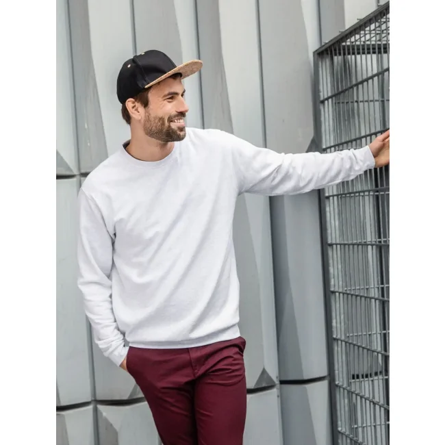 80% cotone, 20% poliestere. Felpa da uomo felpata internamente con banda parasudore nel colletto, polsini in elastane. Etichetta strappabile.