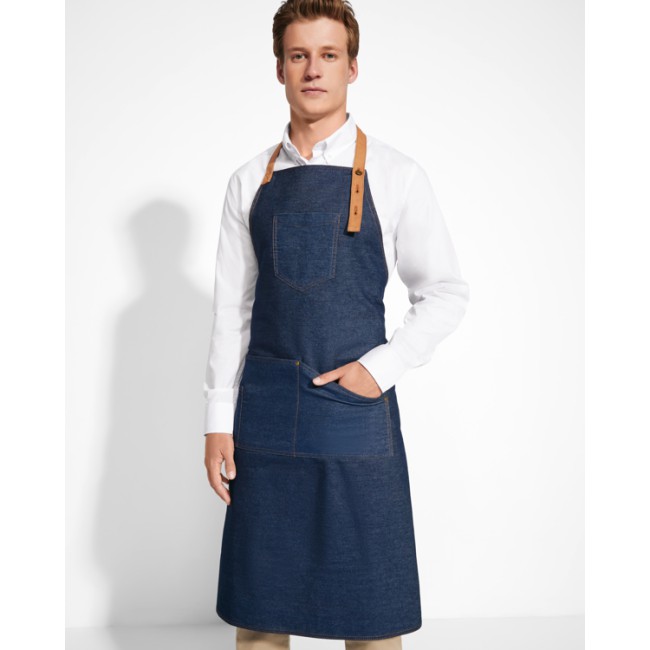 Grembiule lungo in tessuto jeansato:· Nastro del collo in contrasto e regolabile in tre posizione mediante bottoni metallici.· Una tasca sul petto· Quattro tasche frontali con rivetti, uno dei quali specifico per penne.· Nastri laterali in contrasto per allacciarlo.