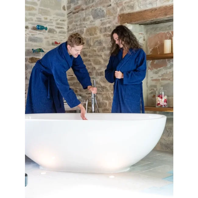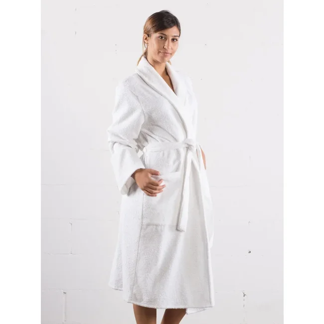 100% cotone. Accappatoio senza cappuccio, ad asciugatura rapida, collo a scialle. Tipo di personalizzazione: ricamo.