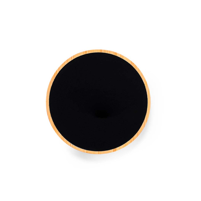 Caricatore wireless circolare. Realizzato in bambù, con elegante superficie nera. Luce LED interna e rivestimento esterno appositamente progettato per la stampa laser, per illuminare il logo. Con funzione di ricarica a 15W, compatibile con i dispositivi dotati di tecnologia di ricarica wireless Qi. Con base antiscivolo, include cavo di ricarica di tipo C e manuale di istruzioni in inglese e spagnolo. Presentato in una scatola individuale dal design kraft.