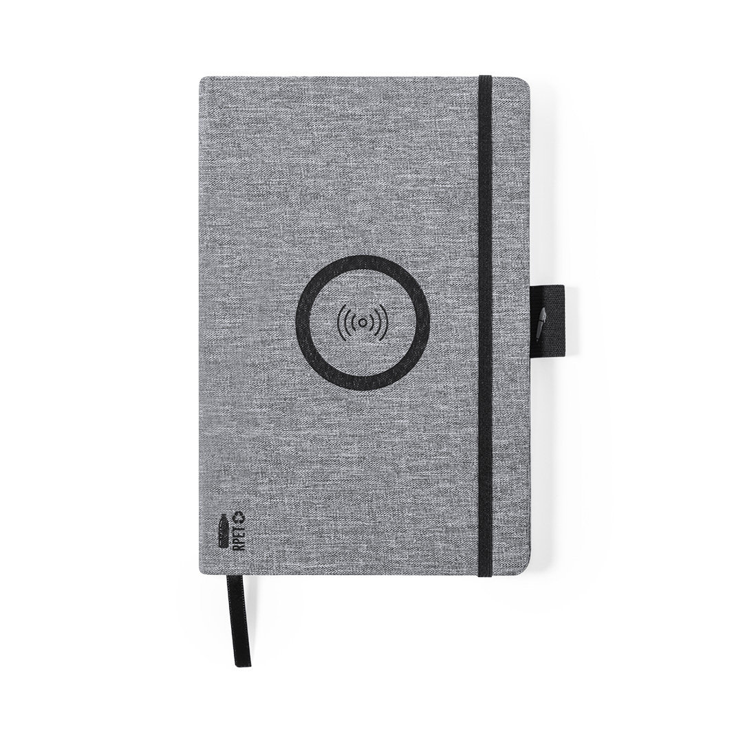 Block note della linea natura - formato A5 - in resistente poliestere 300D RPET realizzato in plastica riciclata per incoraggiare il riutilizzo dei rifiuti plastici e aiutare la sostenibilità del pianeta. Con caricatore wireless 10W integrato nella cover. Include 80 fogli a righe. Compatibile con smartphone dotati di tecnologia di ricarica wireless. Include un cavo di ricarica di tipo C e un manuale di istruzioni in inglese e spagnolo.