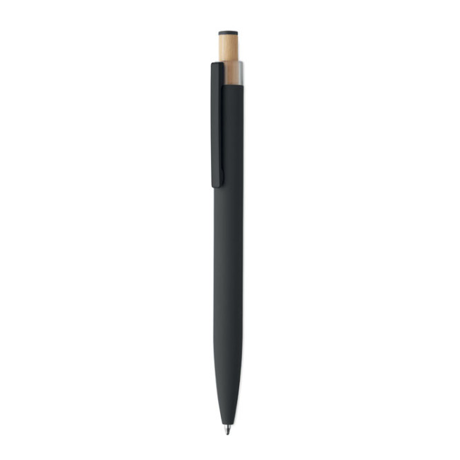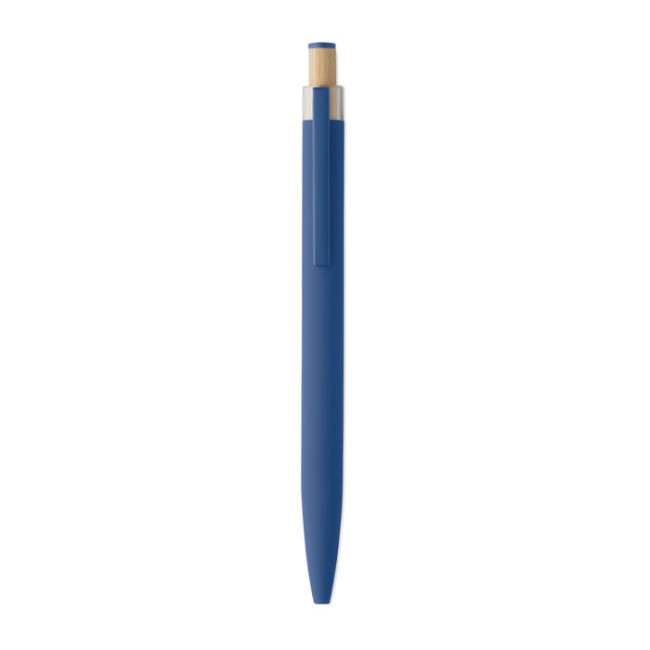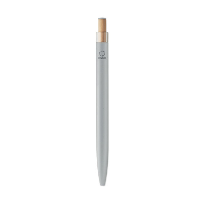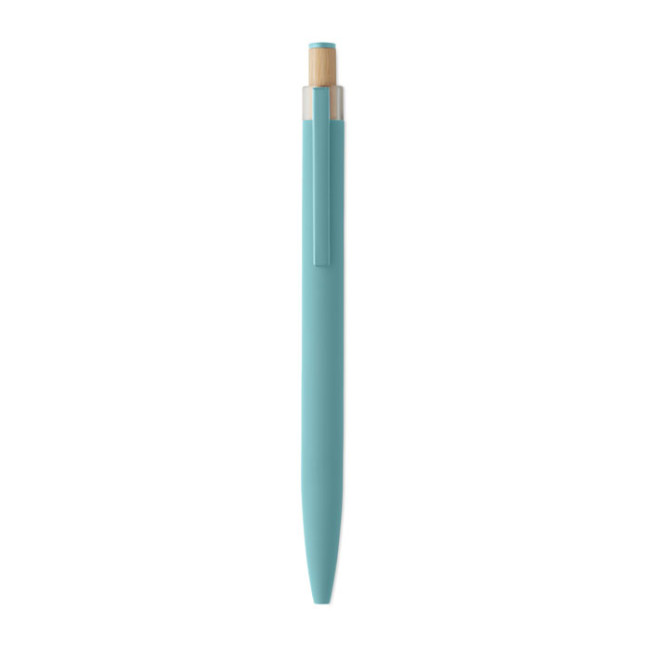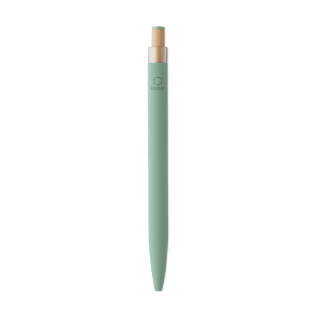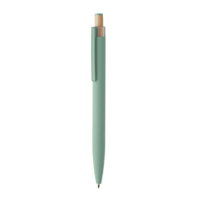 Penna a sfera in alluminio riciclato con pulsante in bambù con dettagli in tinta e clip in metallo abbinata. Inchiostro blu.