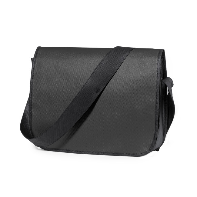 Portadocumenti con patta di chiusura in velcro in resistente TNT con eleganti finiture nere. Con scomparti interni per penne.