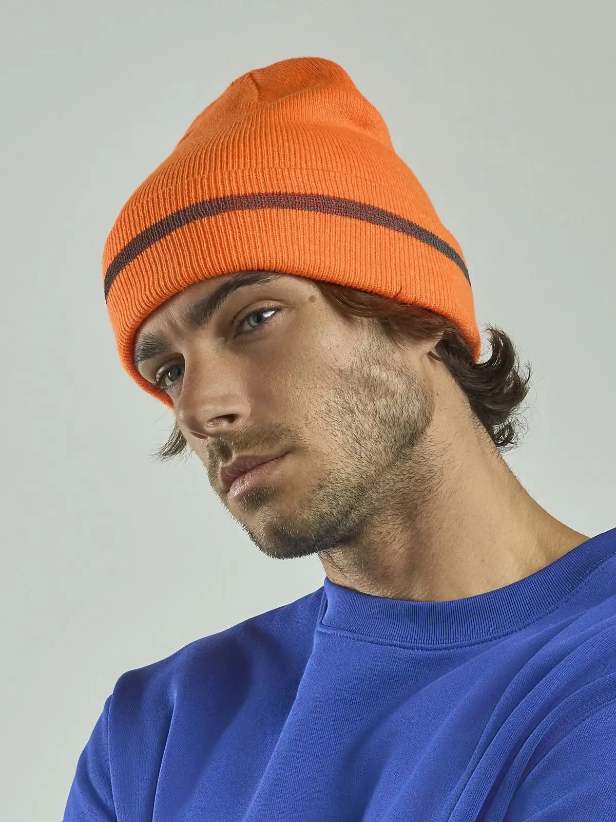 Berretto ad alta visibilità realizzato in poliestere riciclato, dotato di striscia riflettente per una maggiore sicurezza. Il tessuto a doppio strato e la finitura piatta garantiscono comfort e praticità. Etichetta removibile per personalizzazioni senza compromessi.