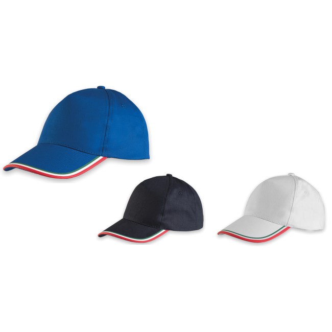 Berrettino 5 pannelli, visiera rigida , chiusura in velcro regolabile in colore abbinato, tricolore stampato sulla visiera. Taglia unica.