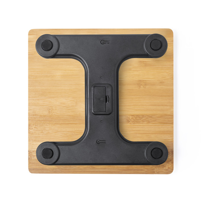 Bilancia pesa persone della linea natura, in bambù, con base antiscivolo. Display digitale, con funzioni di spegnimento automatico, temperatura, tara e selezione dell'unità di peso. Alimentazione a batteria (2xAAA non incluse). Confezionata in un'attraente scatola di eco-design.