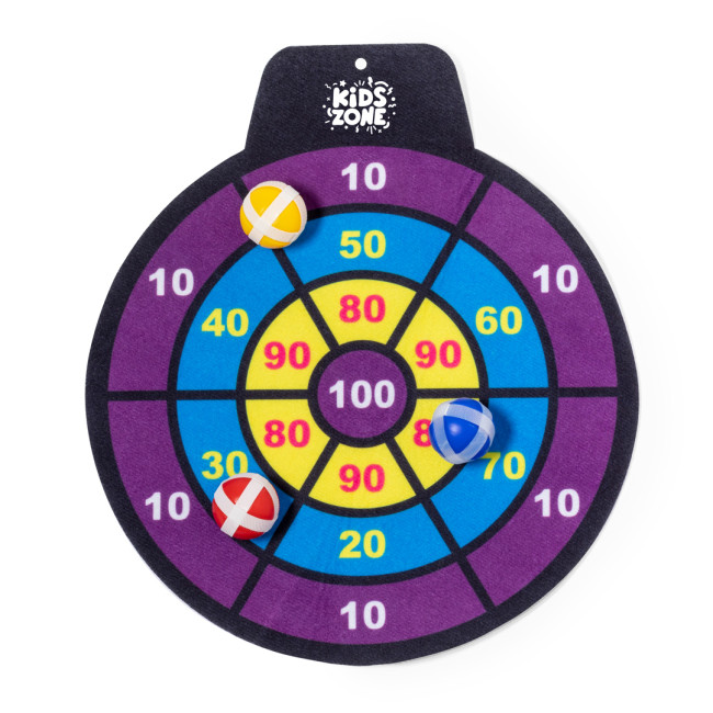 Divertente bersaglio in tessuto con palle in velcro, progettato per tutte le età. Il gioco consiste nel lanciare le palline colorate verso il bersaglio, che offre punteggi. Facile da appendere a qualsiasi altezza grazie a un foro, include un bersaglio flessibile e 3 palline con velcro, presentato in un sacchetto riciclato.